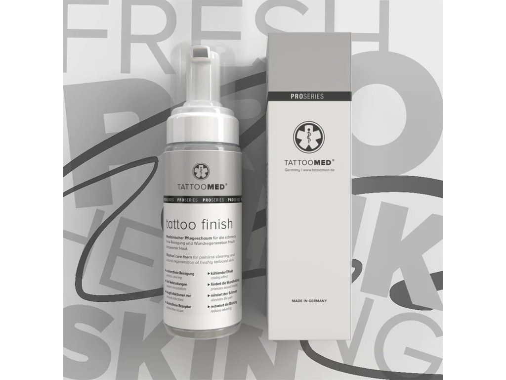 TattooMed Tattoo Finish is de eerste alcoholvrije oplossing voor het reinigen, decontamineren, hydrateren en genezen van acute wonden. De unieke combinatie van het aanwezige polyhexanide-betainecomplex zorgt voor een bijzonder effectieve reiniging van vers gezette tatoeages, vermindert de bacteriële kolonisatie en voorkomt ontstekingen. 4