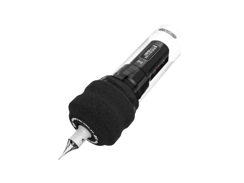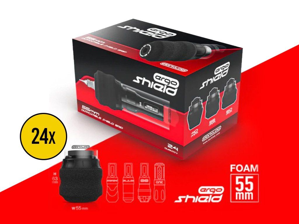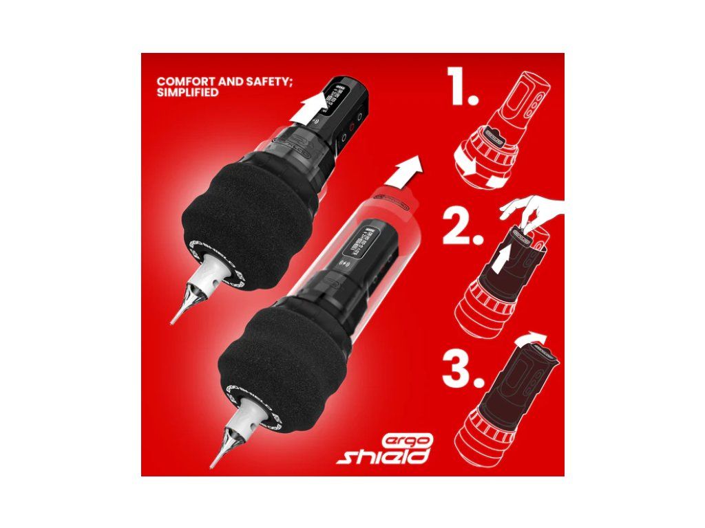Ergo Shield Grip biedt een naadloos geïntegreerde barrière die uw gehele tattoo-machine omhult en zorgt voor compromisloze hygiëne en veiligheid. Zeg vaarwel tegen tijdrovende en omslachtige processen met zakjes met clips, papieren handdoeken, stoffen banden of geïmproviseerde oplossingen. Het proces is eenvoudig: verwijder de ErgoShield uit de steriele blisterverpakking, vervang de originele grip en zodra de schroefdraden vastklikken, trek de ingebouwde barrière uit door aan de sticker te trekken. Na volledig uitgeschoven te zijn, sluit en zet u het uiteinde van de barrière vast door het plakkerige lipje los te trekken. Het is zo simpel!