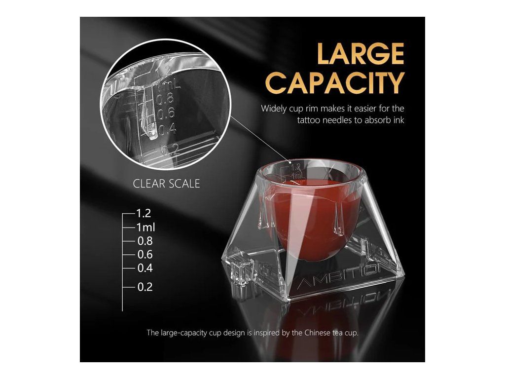 Ambition Inktbekers zijn wegwerp steriele inktbekers met een groter volume, een duidelijke schaalverdeling en een verbindingssysteem. Ze zijn geschikt voor zowel tattoo als PMU werk, overal waar u pigment beter georganiseerd en stabiel wilt bewaren tijdens de sessie.