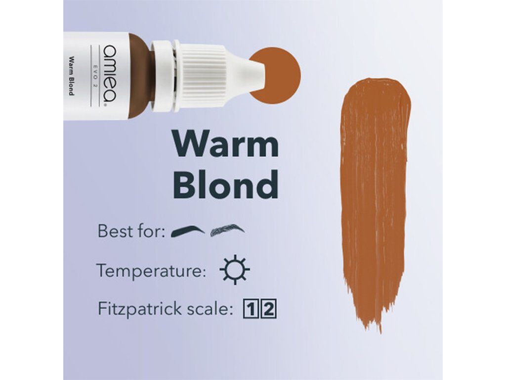 Amiea - Warm Blond is een warme, lichte kleur en de perfecte keuze voor pigmentatie goudblond wenkbrauwen. De oranje ondertone en lichte maststone zorgen voor diepte en expressie voor klanten van alle huidtypen, waardoor het een uitstekende keuze is voor PMU-artiesten en hun klanten met een lichte, koel getinte huid.