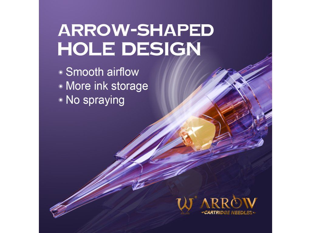 De AVA Arrow Round Liner cartridge is ontworpen voor nauwkeurige lining, contouren en detailwerk. Dankzij de aerodynamische pijlvormige vorm dringt hij soepel de huid binnen en laat stabiele, rechte lijnen achter zonder inktspatten.