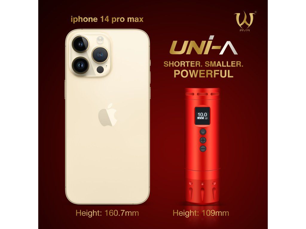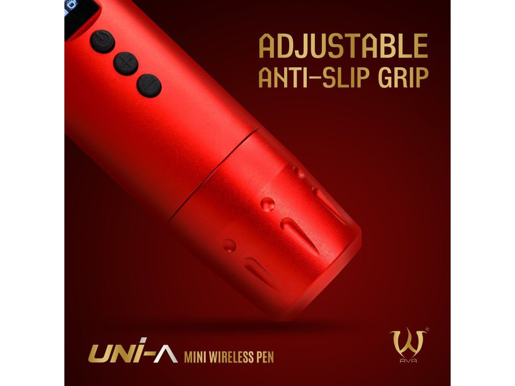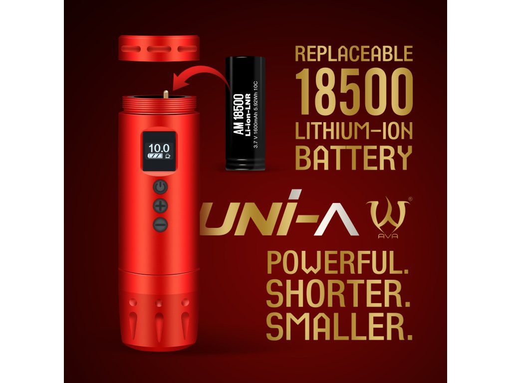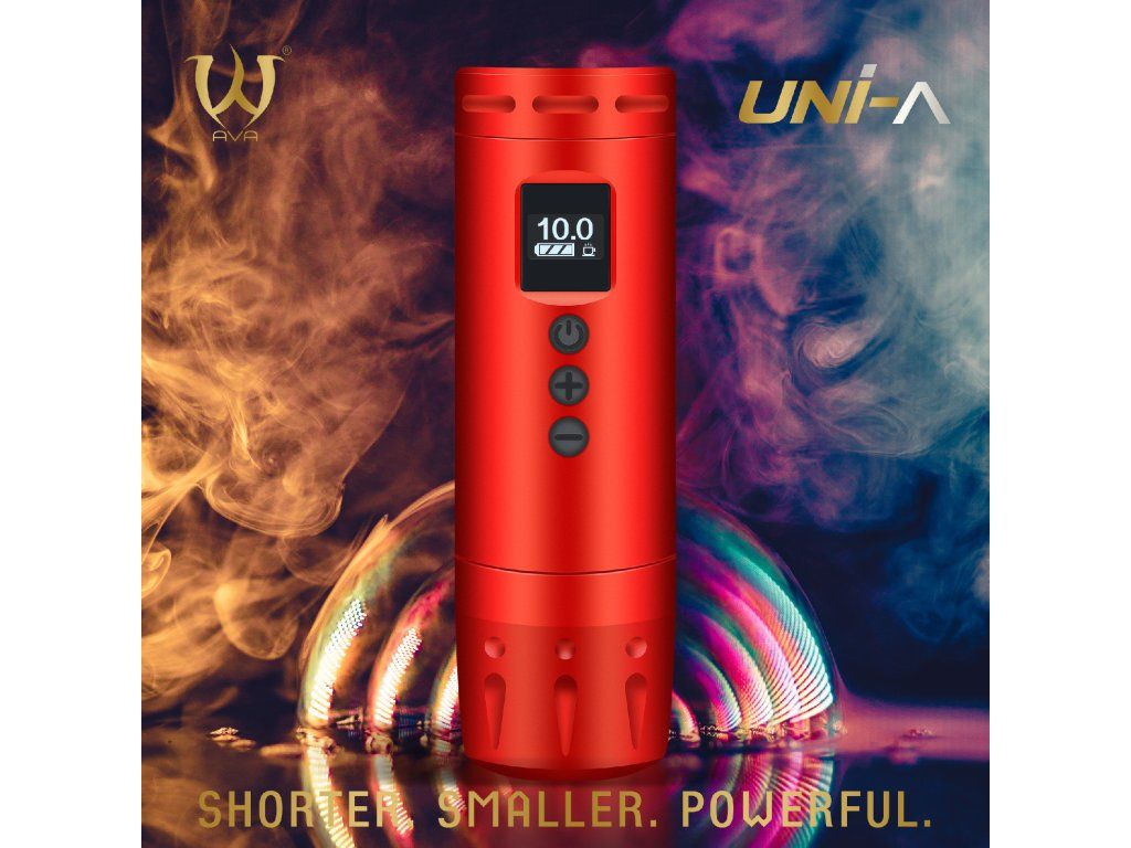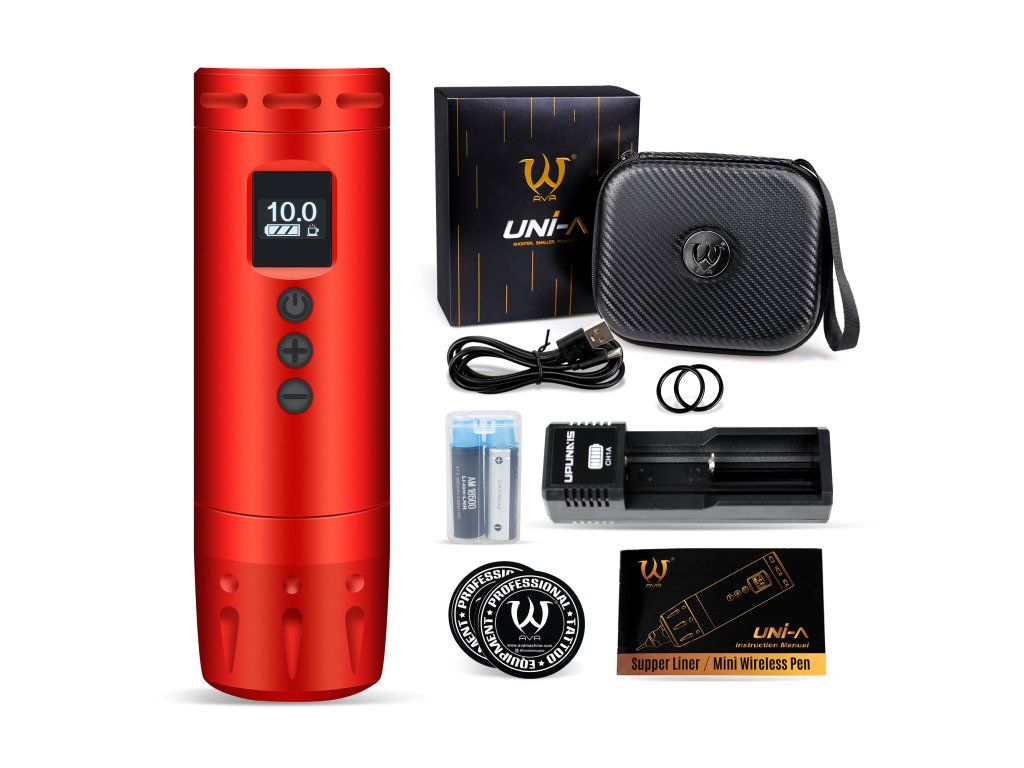 De AVA UNI-A in rode uitvoering met een slag van 4,2 mm is een draadloze tatoeagemachine voor tatoeëerders die de voorkeur geven aan een krachtiger effect. Korte behuizing, laag gewicht en verwisselbare batterij ondersteunen vlot en mobiel werk.