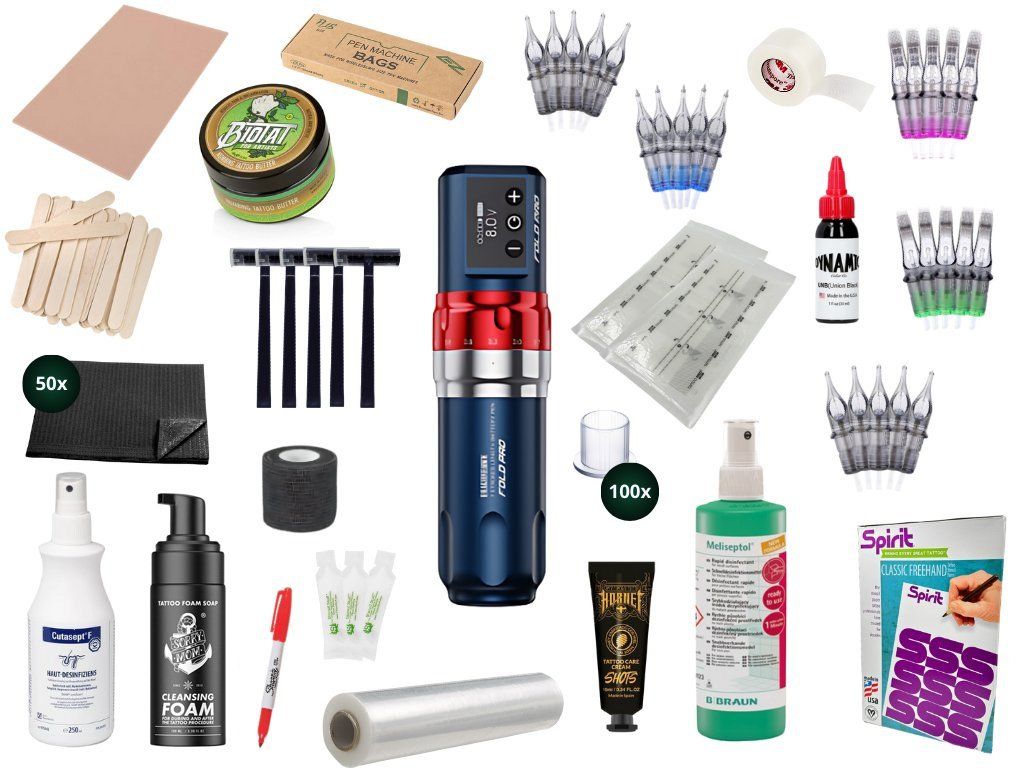 Wil je beginnen met tatoeëren, maar weet je niet wat je allemaal nodig hebt? Deze set bevat de belangrijkste benodigdheden die volgens ons nodig zijn om te beginnen met tatoeëren. De basis is de draadloze batterij-aangedreven machine Fold Pro met variabele slag. In deze set vindt u ook producten die nodig zijn voor het aanbrengen van tatoeages en voor een comfortabele en hygiënische werking. Deze set is ook ideaal als cadeau.