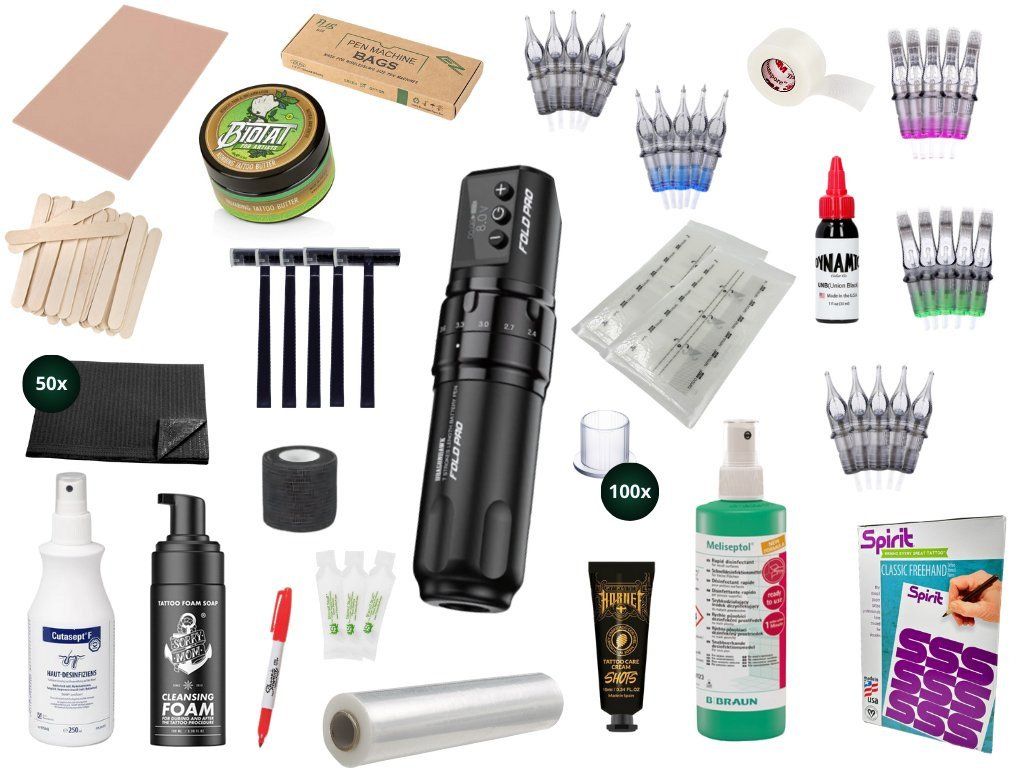Wil je beginnen met tatoeëren, maar weet je niet wat je allemaal nodig hebt? Deze set bevat de belangrijkste benodigdheden die volgens ons nodig zijn om te beginnen met tatoeëren. De basis is de draadloze batterij-aangedreven machine Fold Pro met variabele slag. In deze set vindt u ook producten die nodig zijn voor het aanbrengen van tatoeages en voor een comfortabele en hygiënische werking. Deze set is ook ideaal als cadeau.