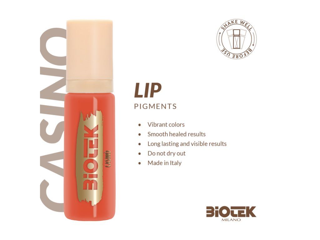 Pigment Biotek Casino is bedoeld voor professioneel gebruik op de lippen, waar een warmere perzik-oranje tint gewenst is. Het blinkt uit in het neutraliseren van donkere lip pigmentatie, wat zorgt voor een helderder en frisser effect. De formulering is gemaakt in Italië van hoogwaardige ingrediënten, is veganistisch en dierproefvrij. Het product voldoet aan zowel Europese als Amerikaanse normen. Het pigment biedt volledige dekking en garandeert na genezing een glad, vlekkeloos resultaat.