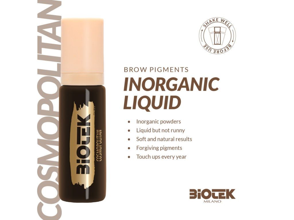 Pigment Biotek Cosmopolitan behoort tot de "Inorganic Liquid / Rapid Shading" lijn en biedt een zeer donkerbruine tint met een bijna zwart effect en een neutrale ondertoon. Het is ideaal voor klanten met een donkerdere huid en natuurlijk donkere wenkbrauwharen, waarbij het doel een volledig schaduw- of opvul-effect is zonder grijze of rode tinten na genezing. De formulering is 100% anorganisch, geproduceerd in Italië, vegan en niet getest op dieren. Het pigment is klaar voor onmiddellijk gebruik zonder de noodzaak om modifiers of verdunners toe te voegen.