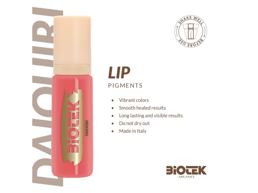 Pigment Biotek Daiquiri is ontworpen voor technici van permanente make-up en microblading voor lippen en biedt een levendige koraal-perzik tint die de lippen een frisse, moderne uitstraling geeft. De kleur dekt effectief, behoudt na genezing de volledige intensiteit en minimaliseert ongewenste kleurovergangen. Het wordt geproduceerd in Italië van hoogwaardige grondstoffen, heeft een veganistische formule en is niet getest op dieren. Het pigment is klaar voor onmiddellijk gebruik, zonder de noodzaak van verdunnen of toevoegen van modifiers.