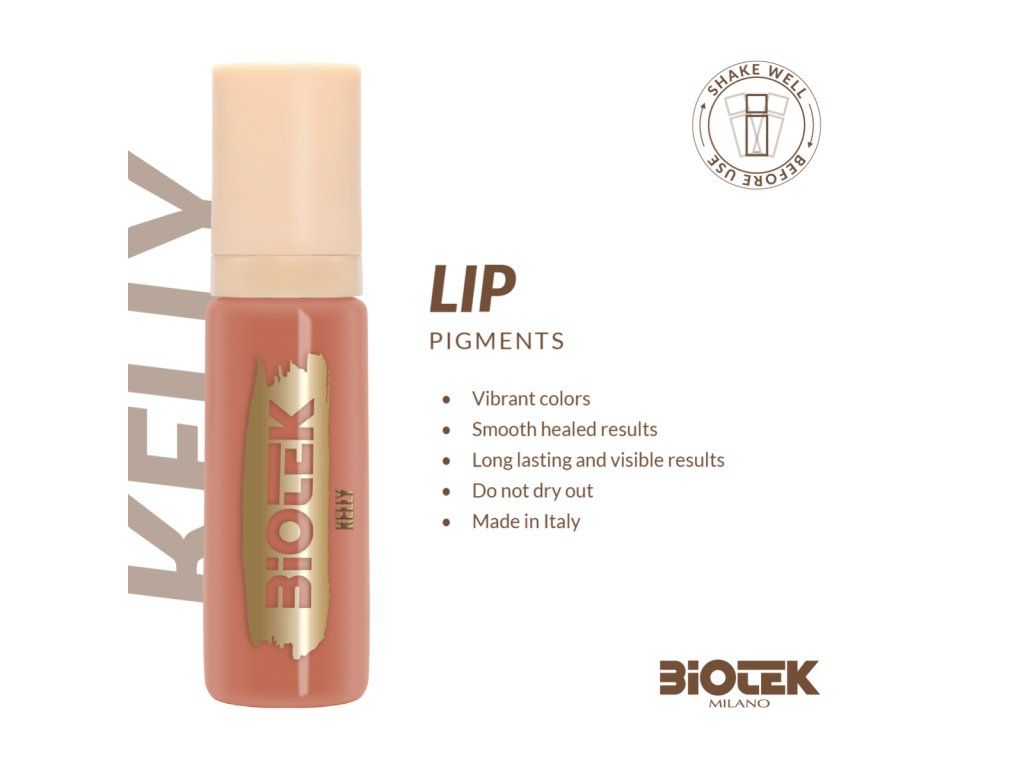 Pigment Biotek Kelly is ontworpen voor gebruik op lippen bij permanente make-up en microblading technieken. De tint is een zachte nude met een perzikachtige ondertoon, ideaal voor lichte lippen of voor het creëren van een natuurlijk effect. De productie vindt plaats in Italië, het pigment is veganistisch en dierproefvrij, en voldoet aan de relevante Europese kwaliteitsnormen. Dankzij de romige consistentie biedt het volledige dekking en een egaal resultaat zonder ongewenste kleurafwijkingen na genezing.