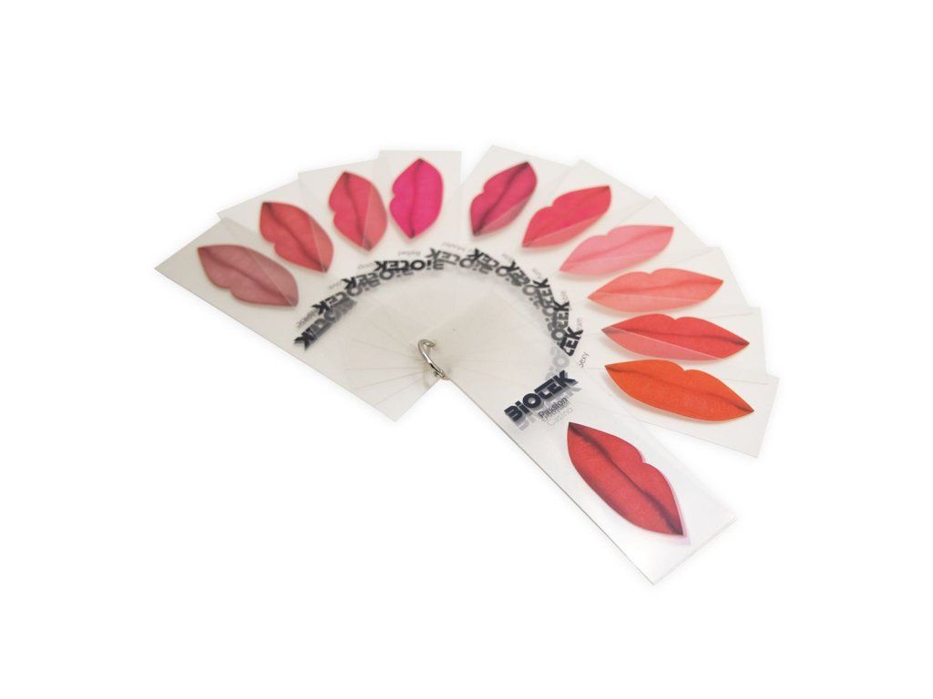 Een leuke palet die uw cliënt kennis laat maken met het assortiment lippenkleuren van BIOTEK. Op elk transparant vel staat een bedrukte mond die de kleur van BIOTEK vertegenwoordigt.
