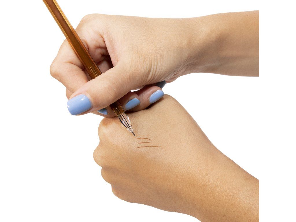 Voordat u met de eigenlijke tatoeage begint, kunt u de haartjes die u wilt tatoeëren op de ooglijnen van uw klant tekenen. Hierdoor kunt u perfecte ooglijnen creëren. Geen ruimte voor fouten!