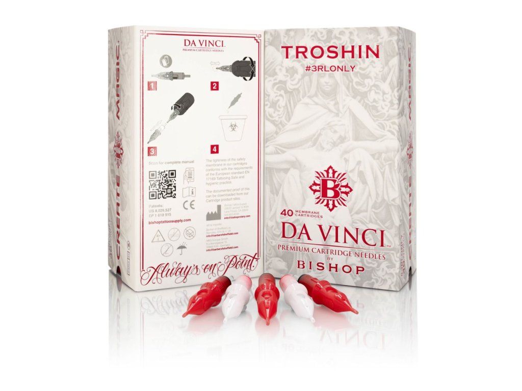 Cartridge Da Vinci V2 x Troshin #3RLONLY zijn ontstaan uit een artistieke samenwerking tussen het merk Bishop en de wereldwijd erkende tattoo-artiest Dmitry Troshin, bekend om zijn realistische stijl en filosofie om uitsluitend te tatoeëren met de 3 Round Liner configuratie.