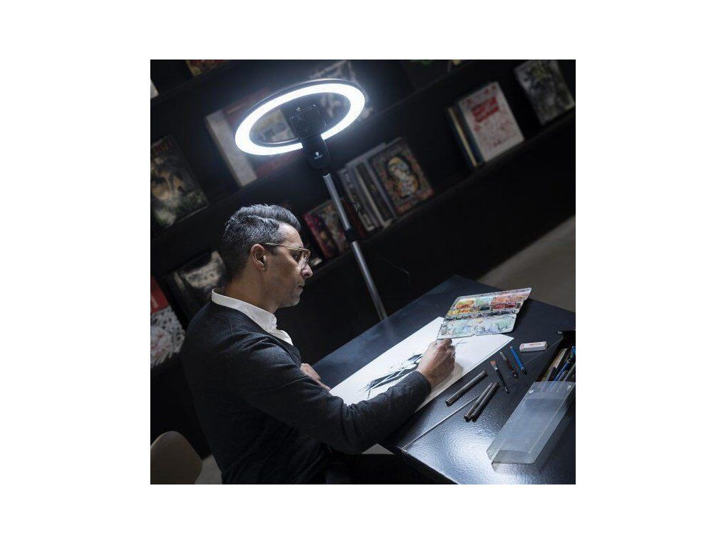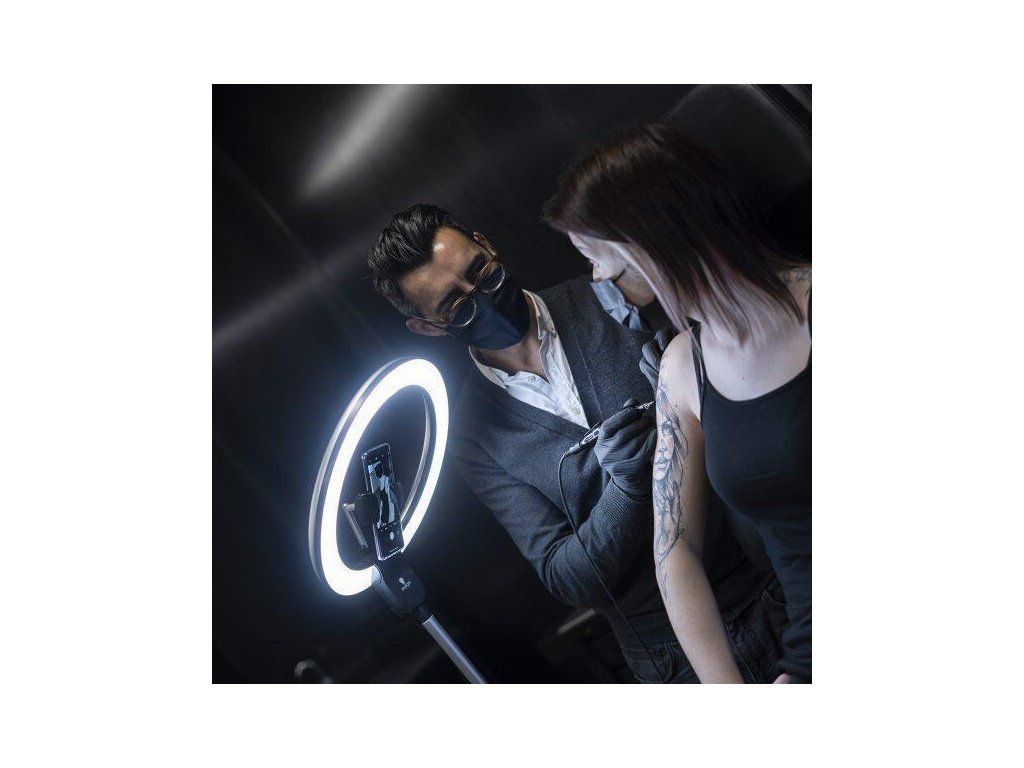 De Daylight Aura Ring Lamp staande lamp is gemaakt van aluminium en bestaat uit verschillende onderdelen die snel en eenvoudig in elkaar passen. Lichtgewicht materiaal, eenvoudige montage en een draagtas zijn ontworpen voor degenen die draagbaarheid waarderen. De ringvorm reflecteert een gelijkmatige lichtverdeling en schaduwvrij licht, wat zorgt voor een comfortabeler gevoel voor de ogen. Met een kleurweergave-index (CRI) van meer dan 90+ straalt de Daylight Aura Ring licht uit dat nauw aansluit bij de kleuren van natuurlijk licht (CRI 100), wat zorgt voor een nauwkeurige waarneming van kleuren en contrasten. De kleurentemperatuur van de Daylight Aura Ring is 6000 Kelvin en straalt neutraal licht uit dat het dichtst bij natuurlijk licht ligt. Het is de ideale temperatuur voor degenen die op zoek zijn naar een nauwkeurige waarneming van kleuren en contrasten. Hij is uitgerust met een smartphonehouder en is een onmisbaar hulpmiddel voor digitale content creators zoals kunstenaars, illustratoren, tatoeëerders, make-upartiesten, youtubers, enz. Belangrijkste kenmerken: 4500lx CRI 90+ 6000k Mobiele telefoonhouder en USB-poort Telescopische standaard Volledig variabele lichtintensiteit Nauwkeurige weergave van huidtinten Vlakke en stabiele basis Technische kenmerken: Lichtbron: LED Lumen: 2100 lm Lux op 30 cm: 4500 Kleurtemperatuur: 6.000 ° K. CRI: 90+ Energieverbruik: 29 W. Kleur: zilver / zwart Nominale levensduur LED (uren): 50.000 Continue dimmer Hoogte: 198 cm (78") Lichtmaat 35,5 cm Breedte: 61 cm (24″) Diepte: 57,5 cm (22,6″) Gewicht: 2,6 kg (5,7 lb) inclusief tas Snoerlengte: 3,5 m (137,8″) Ideaal voor: Make-upartiesten Haarstylisten Schoonheidsspecialisten Bloggers