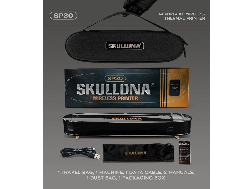 SKULLDNA SP30 is een draagbare thermische printer, ontworpen voor het gemakkelijk afdrukken van stencils zonder de noodzaak van een permanente kabelverbinding. Ondersteunt verbinding via Bluetooth en USB, werkt samen met telefoons, tablets en computers, en is compatibel met Android, Apple, Windows en MacOS systemen. De printer maakt gebruik van A4-formaat, heeft een glanzend oppervlak in pianolak-stijl en is voorzien van een kleurendisplay waarop de operationele status van het apparaat kan worden gevolgd.
