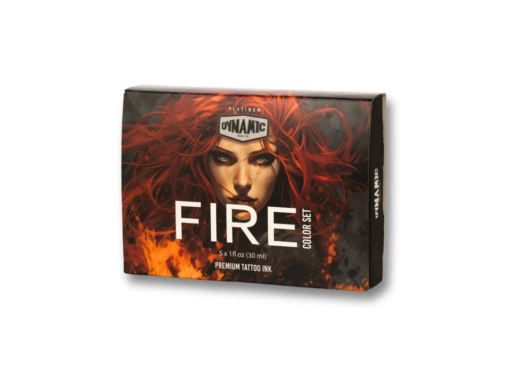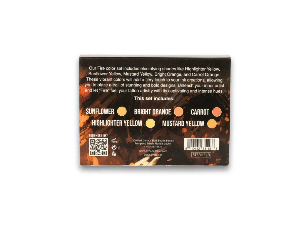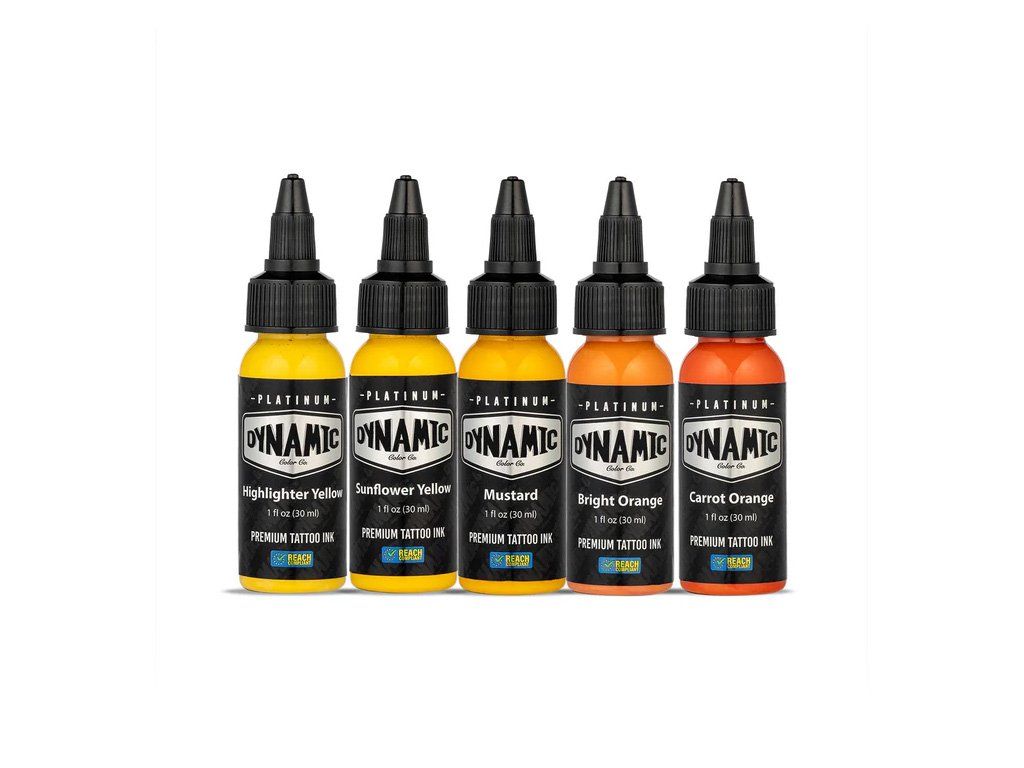 De Fire-set van Dynamic Platinum bevat 5 vurige tinten – Highlighter Yellow, Sunflower Yellow, Mustard Yellow, Bright Orange en Carrot Orange – ideaal voor opvallende tatoeages vol warmte, energie en intensiteit.