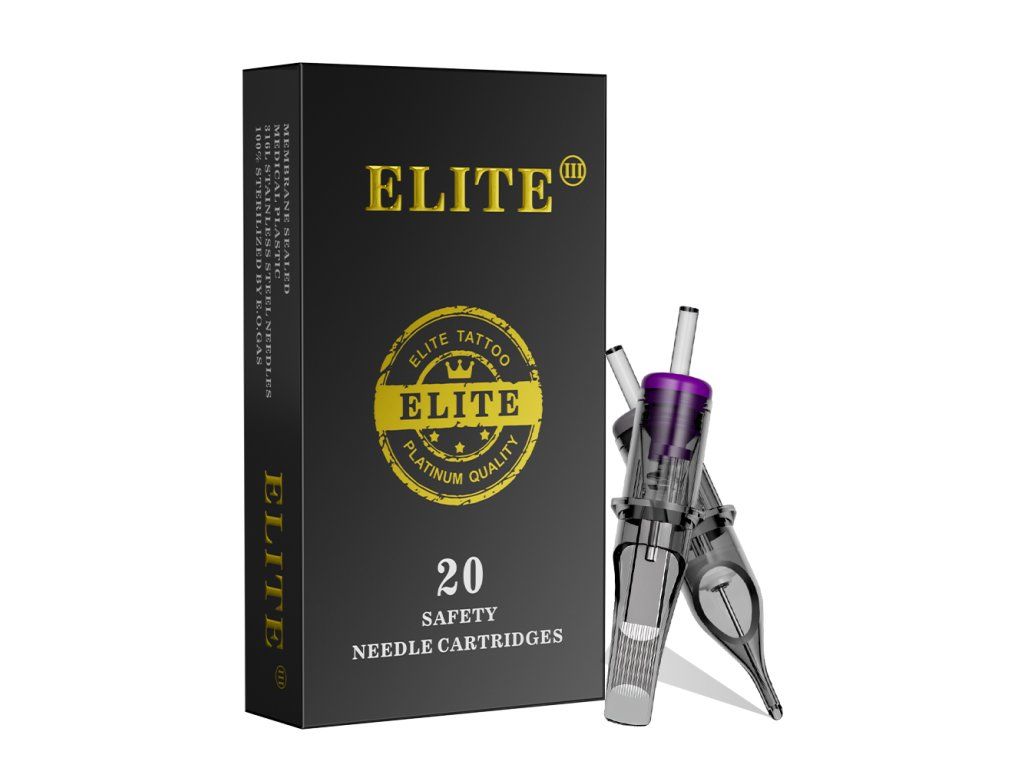 Kwalitatieve ELITE III cartridges. 1. bevatten een membraan, zodat inkt niet in de grip en vervolgens in de machine kan doordringen 2. lichtgewicht body van transparant plastic voor eenvoudige controle 3. lagere naaldweerstand - hogere snelheden mogelijk bij minder belasting van de machine 4. afgeronde punt voor eenvoudiger werk 5. gladde afwerking - irriteert de huid van de klant niet 6. compatibel met cartridge machines en grips 7. EO gas sterilisatie 8. naald gemaakt van 304 roestvrij staal voor medische doeleinden 9. 20 naalden per doosje 10. eenvoudig openen en sluiten van het doosje 11. breed scala aan configuraties 12. lange houdbaarheid 13. kleurcodering op type