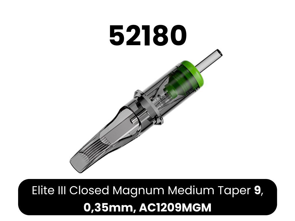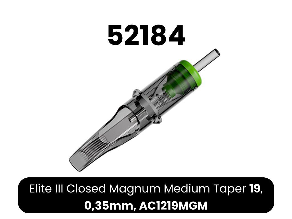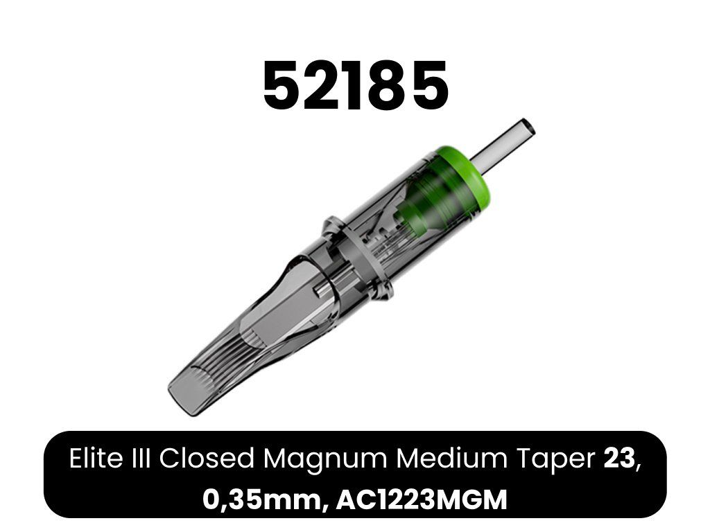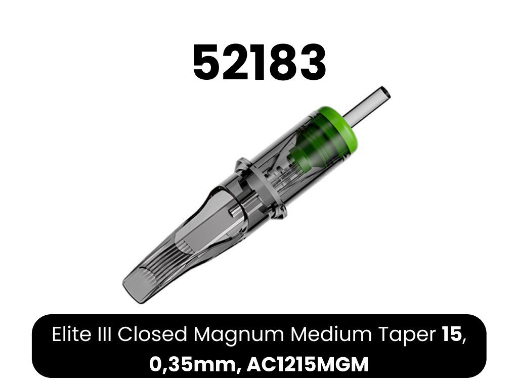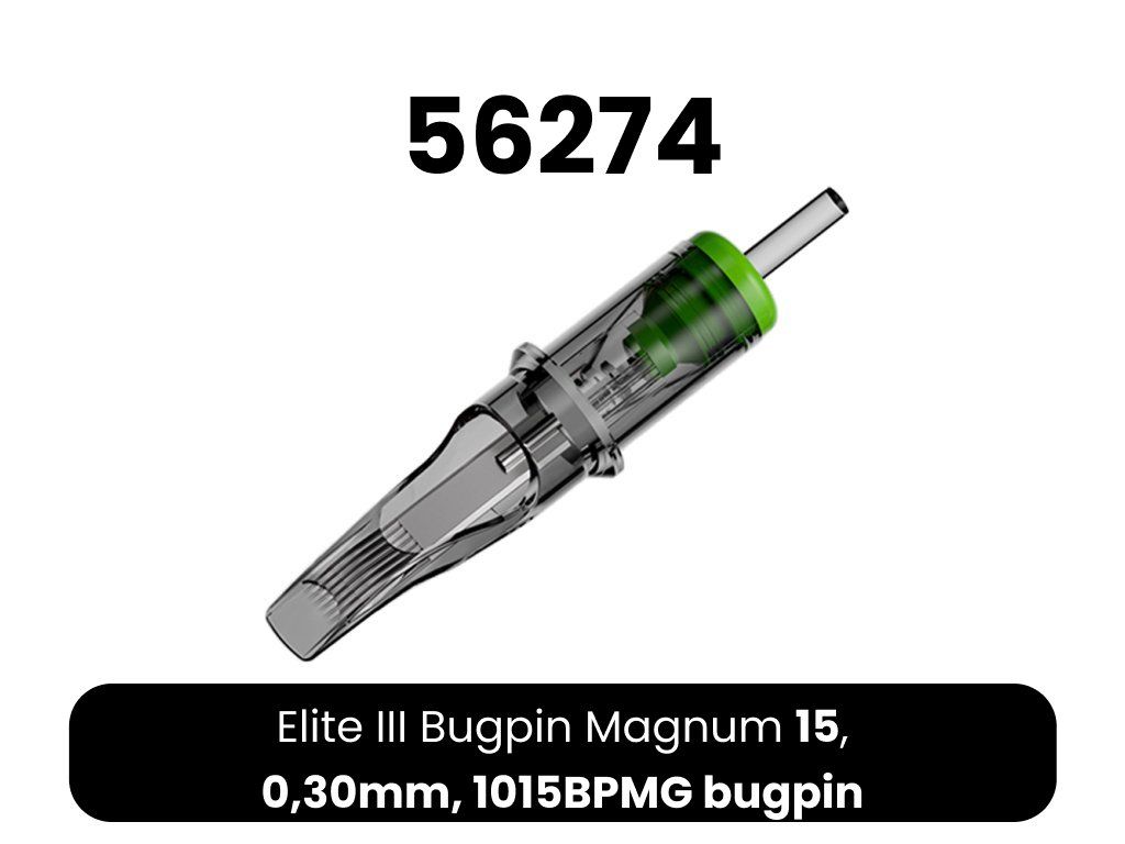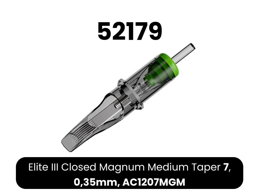 Kwalitatieve ELITE III cartridges. 1. bevatten een membraan, zodat inkt niet in de grip en vervolgens in de machine kan doordringen 2. lichtgewicht body van transparant plastic voor eenvoudige controle 3. lagere naaldweerstand - hogere snelheden mogelijk bij minder belasting van de machine 4. afgeronde punt voor eenvoudiger werk 5. gladde afwerking - irriteert de huid van de klant niet 6. compatibel met cartridge machines en grips 7. EO gas sterilisatie 8. naald gemaakt van 304 roestvrij staal voor medische doeleinden 9. 20 naalden per doosje 10. eenvoudig openen en sluiten van het doosje 11. breed scala aan configuraties 12. lange houdbaarheid 13. kleurcodering op typeCE-certificaat voor Elite cartridges