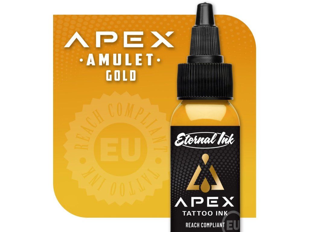 AMULET | GOLD: Deze majestueuze, stralende gouden kleur symboliseert rijkdom en overvloed. Het kan een vleugje luxe en elegantie toevoegen aan tatoeageontwerpen, vooral die geïnspireerd zijn door koninklijkheid of spiritualiteit.