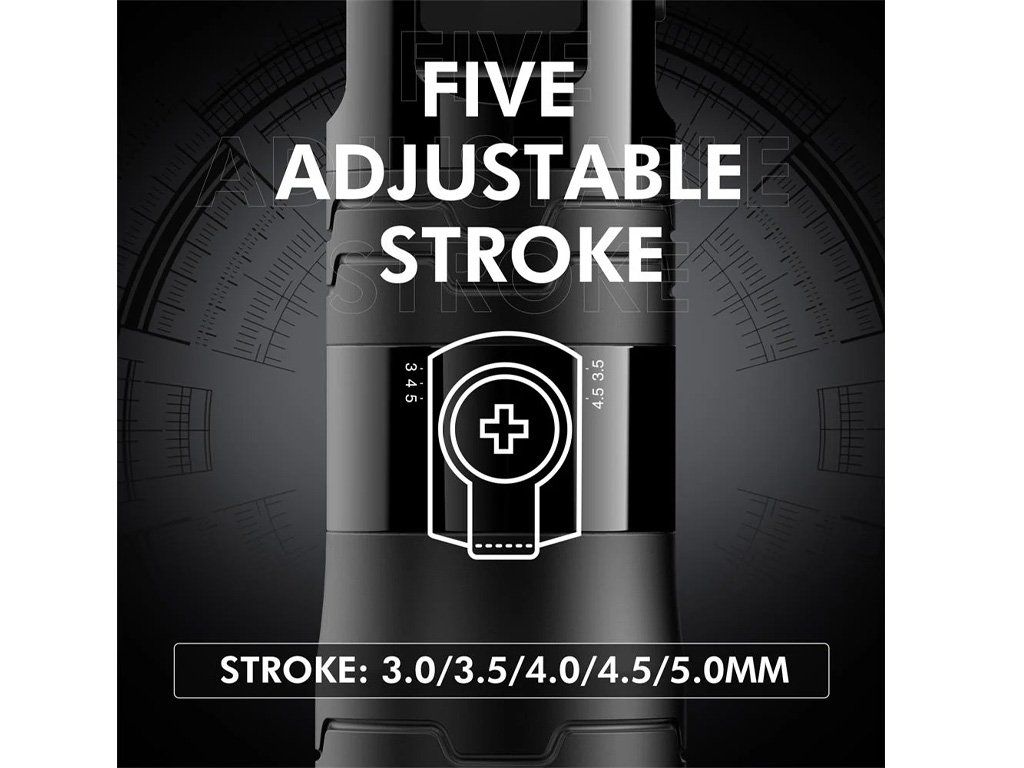 - Verstelbare slaglengte (6 verschillende instellingen - 3,0/3,5/4,0/4,5/5,0 mm), de slag wordt gewijzigd met een inbussleutel