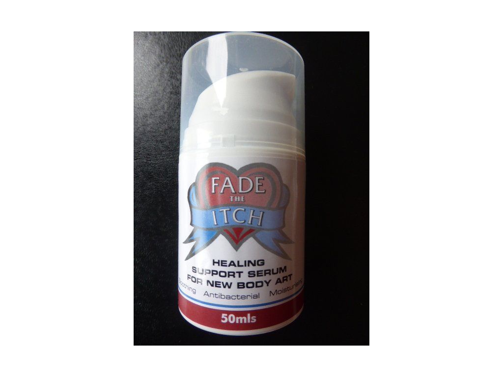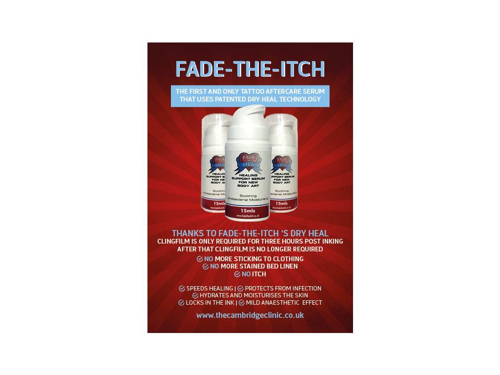 Fade The Itch is het eerste en enige nazorgserum voor tatoeages dat gebruik maakt van gepatenteerde dry-healing technologie om nieuwe lichaamsversieringen te genezen en te beschermen. Het serum bedekt de tekening met een zacht antibacterieel schild, wat betekent dat de kleeffolie slechts de eerste drie tot vier uur na het aanbrengen van de kleur nodig is. De niet-vette formule trekt snel en gemakkelijk in, verstopt de poriën niet en laat de huid ademen. Klanten kunnen hun dagelijkse leven voortzetten zonder zich zorgen te hoeven maken dat de kunstwerken aan kleding blijven plakken of beddengoed bevlekken.