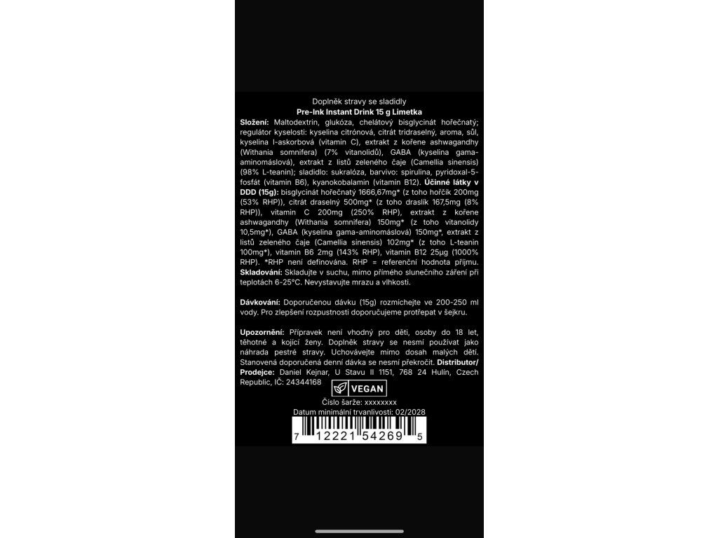 Het product combineert koolhydraten, elektrolyten, magnesium, vitamine C, ashwagandha, GABA en L-theanine in één dosis. Het is geschikt voor klanten die vóór de sessie een eenvoudig en snel regime willen hebben zonder ingewikkelde afmetingen.
