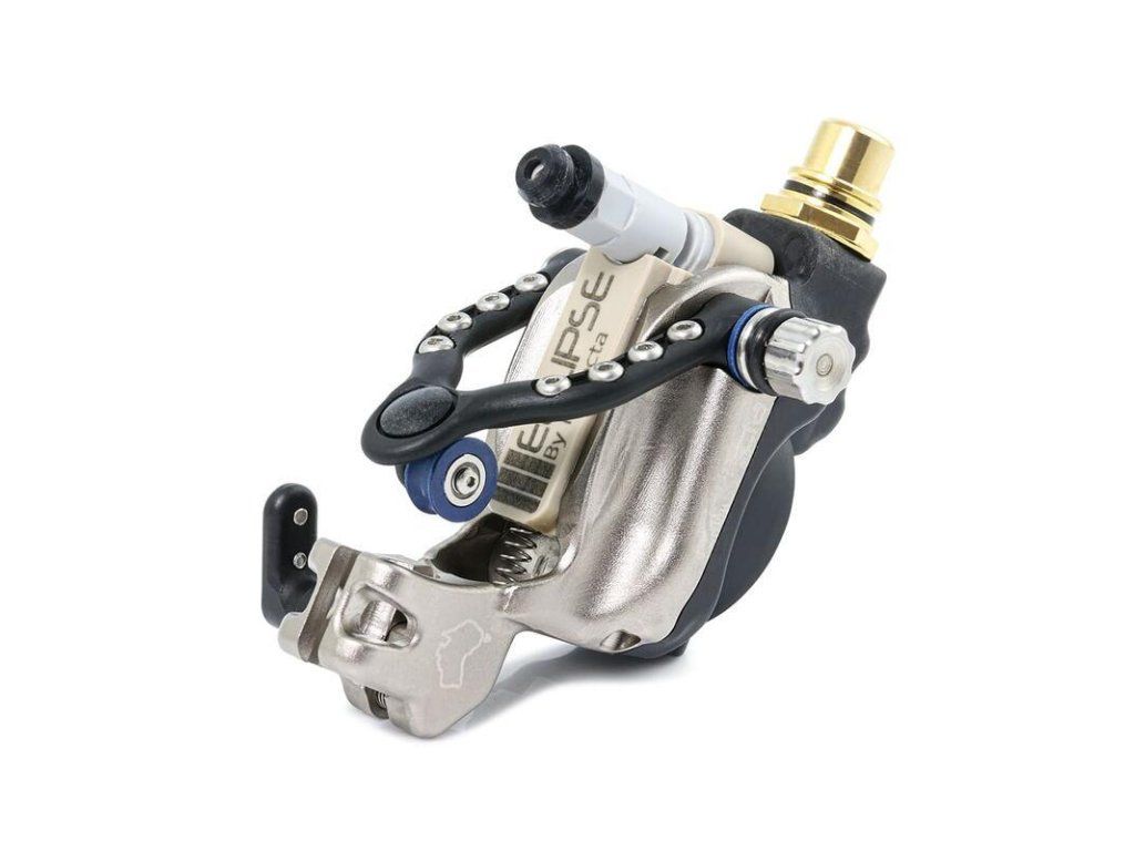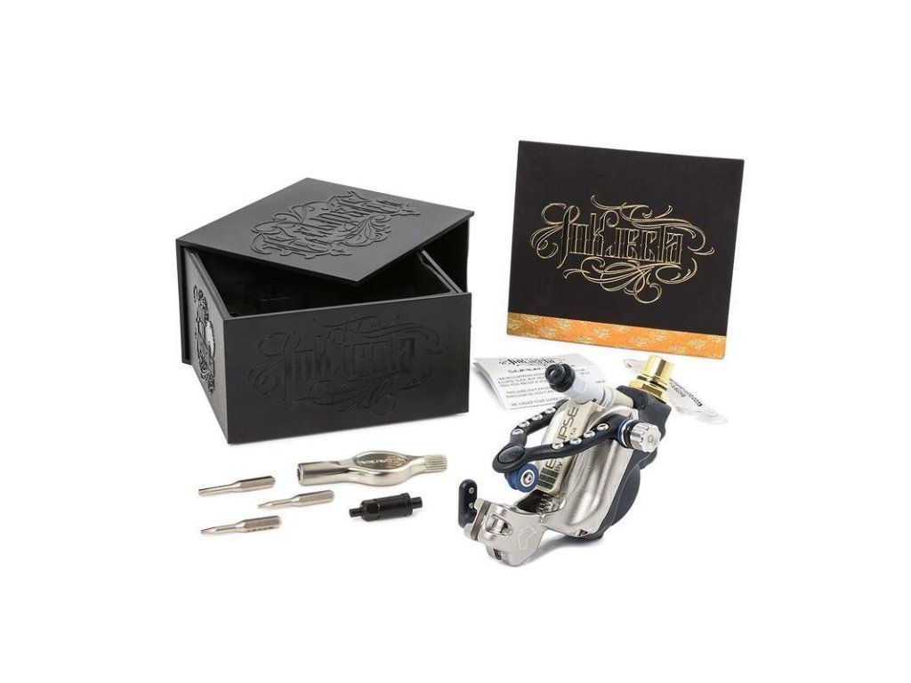 De Eclipse tattoo-machine van de Australische fabrikant Injkecta biedt hoge prestaties bij gebruik van klassieke naalden, grips en tips. De behuizing is gemaakt van vliegtuigaluminium. De motor is op maat gemaakt met behulp van nanotechnologie en het motorframe is gemaakt van composietmaterialen voor minimaal gewicht. De Eclipse ondersteunt een breed bereik van 4,5 tot 18 volt, een zeer sterke gripvergrendeling, een naaldstabilisator met instelbare "give" en naaldbevestiging van hoogwaardig materiaal uit de medische industrie. Specificaties: behuizing van vliegtuigaluminium, gewicht 70 g, spanning van 4,5 V - 18 V, 3,25 mm chroom nok inbegrepen, op maat gemaakte motor met behulp van nanotechnologie, Cinch/RCA-connector, dubbele gripbevestiging, handmatig geproduceerde naaldslag, naaldstabilisator met instelbare "give", Flex pin-systeem. Inbegrepen in het pakket: Inkjecta Eclipse smeermiddel Inox MX6 gereedschap