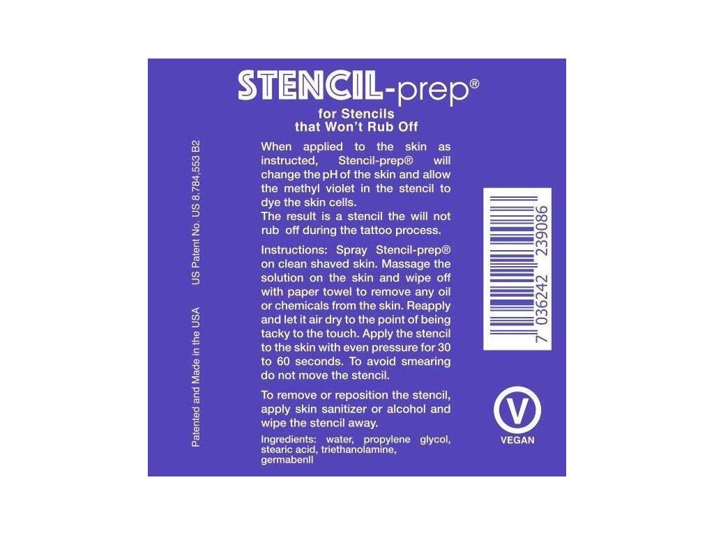 Prep Spray van InkJet Stencils werkt als een fixatief voor tatoeagemotieven voor de afdruk op de huid, zowel van een printer of kopieerapparaat als via klassiek kopieerpapier. Instructies: Spray de Spray Stencil Prep op de schone, geschoren huid. Masseer in de huid en reinig resten van oliën en chemicaliën met ValaClean of een doekje. Breng opnieuw aan en laat drogen totdat de huid plakkerig aanvoelt. Druk vervolgens de transfer gedurende 30 - 60 seconden aan. We raden aan om InkJet Stencils inkt te gebruiken voor Epson EcoTank printers en InkJet Stencil Tracing Paper. Eventueel klassiek kopieerpapier van ReproFX. Inhoud van de verpakking is 240 ml in een spuitbus. Natuurlijk is er een lange weerstand tegen slijtage tijdens het werk.