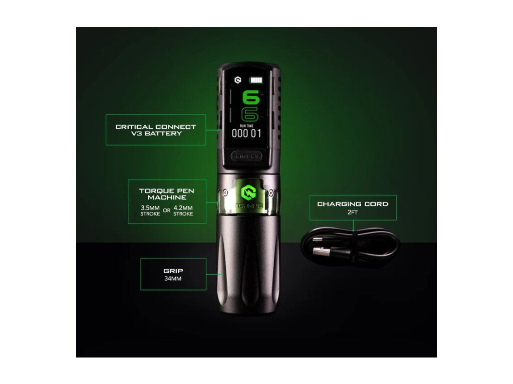 De draadloze tatoeagemachine Critical Torque maakt gebruik van de eerste Precision Strike-technologie in de branche voor soepeler, sneller en efficiënter tatoeëren. Oplossingen voor trillingsdemping zorgen voor een soepele en probleemloze tatoeëerervaring. De batterij met uitgebreide functies en een groter, intuïtief 1,5-inch kleurendisplay zitten boordevol functies, waaronder een timerfunctie om de tatoeagetijd te meten. Het motorontwerp verhoogt de stijfheid en levert meer koppel en vermogen.