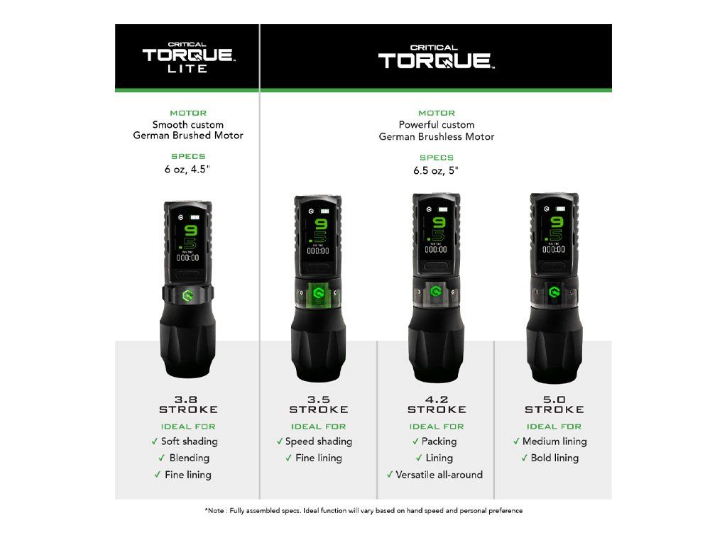 Nieuw in de wereld van Critical Torque? Verbeter uw tattoo-ervaring door de Torque Lite Motor Bolt te combineren met een 40mm Torque-grip en een magnetische batterij naar keuze.