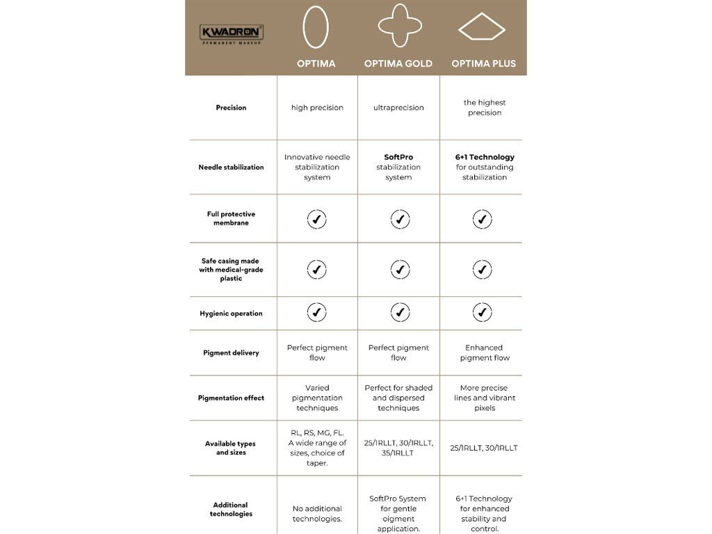 Nieuw in de wereld van permanente make-up. Dankzij jarenlange ervaring in de tatoeage-industrie kunnen we nieuwe producten op het gebied van permanente make-up presenteren - KWADRON PMU Optima cartridges. Kwadron PMU Optima stelt u in staat om perfecte permanente make-up te creëren. Dankzij een uniek stabilisatiesysteem van ultra-scherpe naalden, die zorgen voor sterkte en een lange levensduur. De behuizing van de cartridge is gemaakt van medisch plastic. Beperkt de wrijving tussen de naald en de behuizing van de cartridge tot een minimum. Het geïntegreerde naaldsysteem garandeert de naleving van de hoogste hygiënische en veiligheidsnormen. Elke individuele Kwadron PMU Optima cartridge is afzonderlijk verpakt in een steriele wegwerpverpakking. KWADRON® PMU OPTIMA CARTRIDGES zijn compatibel met de meeste populaire tatoeagemachines, zoals EQUALISER PROTON, Cheyenne Hawk, FK Irons en andere. RS Round Shader - schaduwcartridge met ronde naalden MG Magnum - platte dubbele rij cartridges FL Flat - platte enkele rij cartridges CF Slope/Cut Flat - cartridge met schuine punt PT Point taper (2,5 mm dubbel geslepen) UT Ultra Short Taper (2 mm) - zeer korte punt