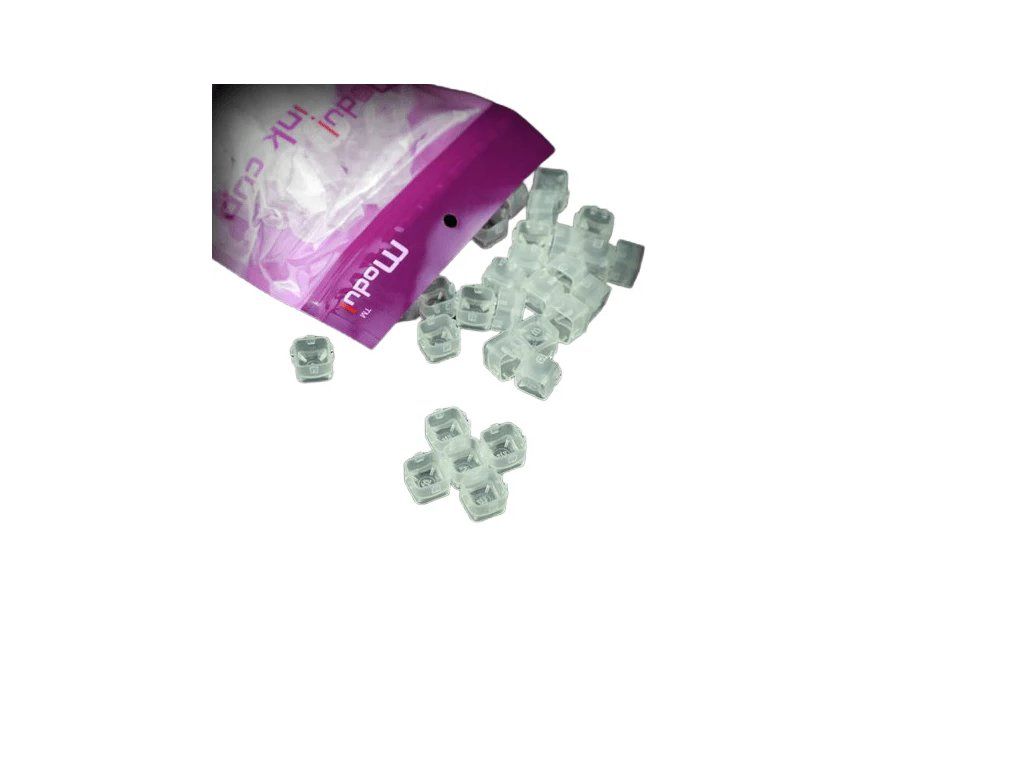 Modulaire cupjes zijn ontworpen om in willekeurige configuraties te worden gecombineerd om uw eigen kleurenpalet te creëren zonder dat er een aparte cupjeshouder of vaseline nodig is om ze te fixeren. Dankzij de vierkante vorm en het kliksysteem blijven ze na het verbinden stabieler op het werkoppervlak liggen en verminderen ze het risico op omvallen of verschuiven tijdens het werk. Het transparante materiaal vergemakkelijkt tevens een snelle oriëntatie in de inktkleuren. Dit type is geschikt voor tatoeëerders die kleuren overzichtelijk gegroepeerd, snel toegankelijk en georganiseerd willen hebben volgens hun eigen workflow. De cupjes zijn hygiënisch verpakt en worden geleverd in een verpakking van 100 stuks. Volgens de beschikbare informatie is de afmeting 15 × 15 mm, waarbij sommige winkels ook een hoogte van 12 mm en een binnendiameter van 12 mm vermelden.