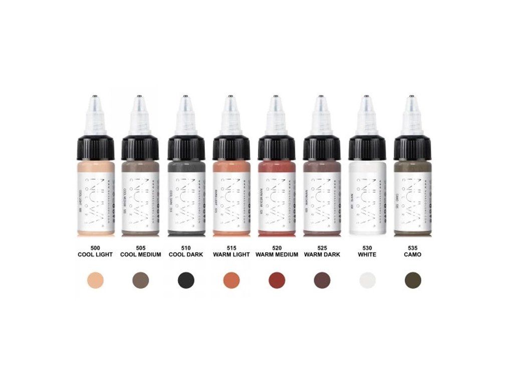 NUVA COLORS pigmenten zorgen voor rijke en langdurige effecten. Kies uit zes pigmentensets, speciaal geselecteerd voor verschillende pigmentatiegebieden, waaronder lippen, wenkbrauwen, oogleden, areola's, littekens en hoofdhuid. NUVA COLORS zorgt elke keer voor een soepele en uniforme applicatie.