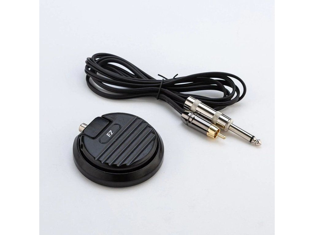 Rond metalen zwaar pedaal in rood met RCA connector en RCA kabel in de doos.