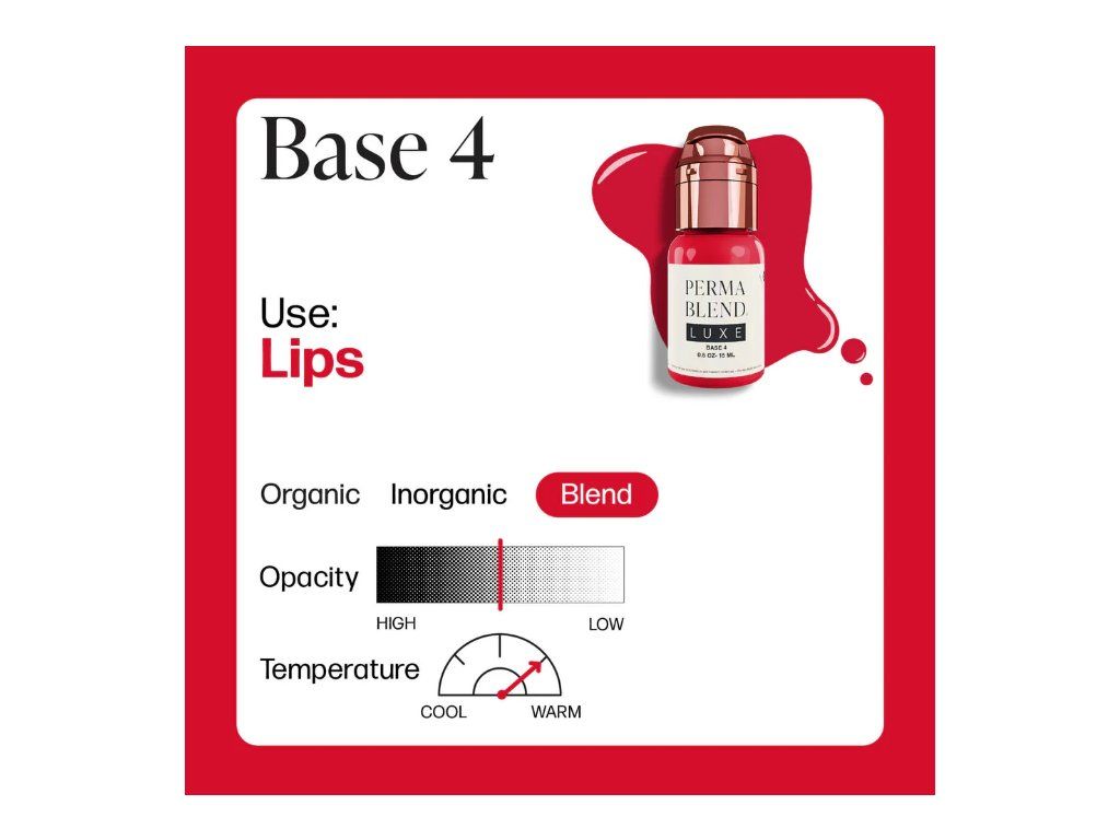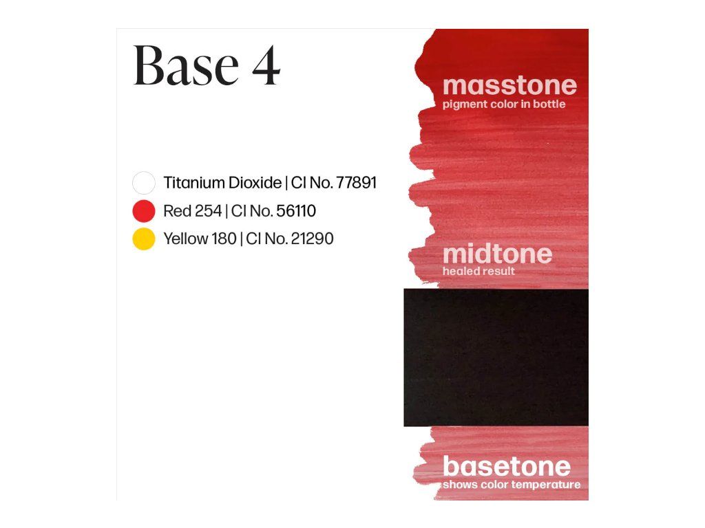 Base 4 is een mix van warme en koele rode tinten, die titaniumdioxide bevat voor maximale dekking en de nodige correctie. Deze formulering is bedoeld om te verdunnen en moet worden gecombineerd met Embody Set Mods 1-3 of een schaduwoplossing.