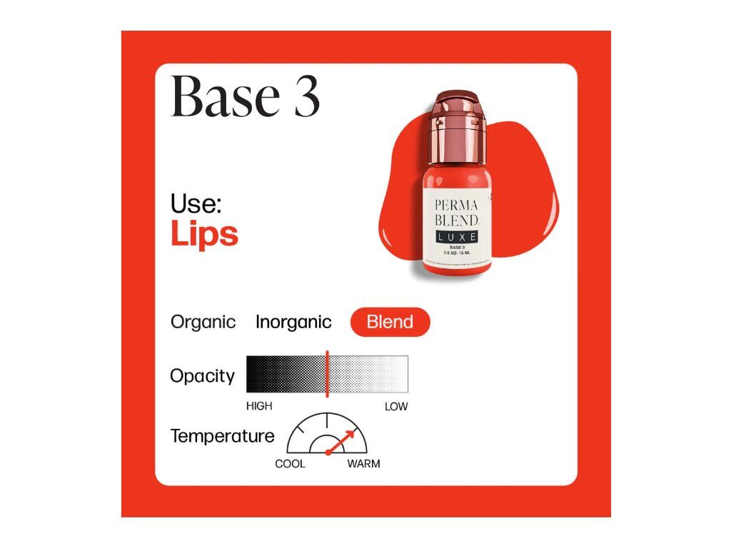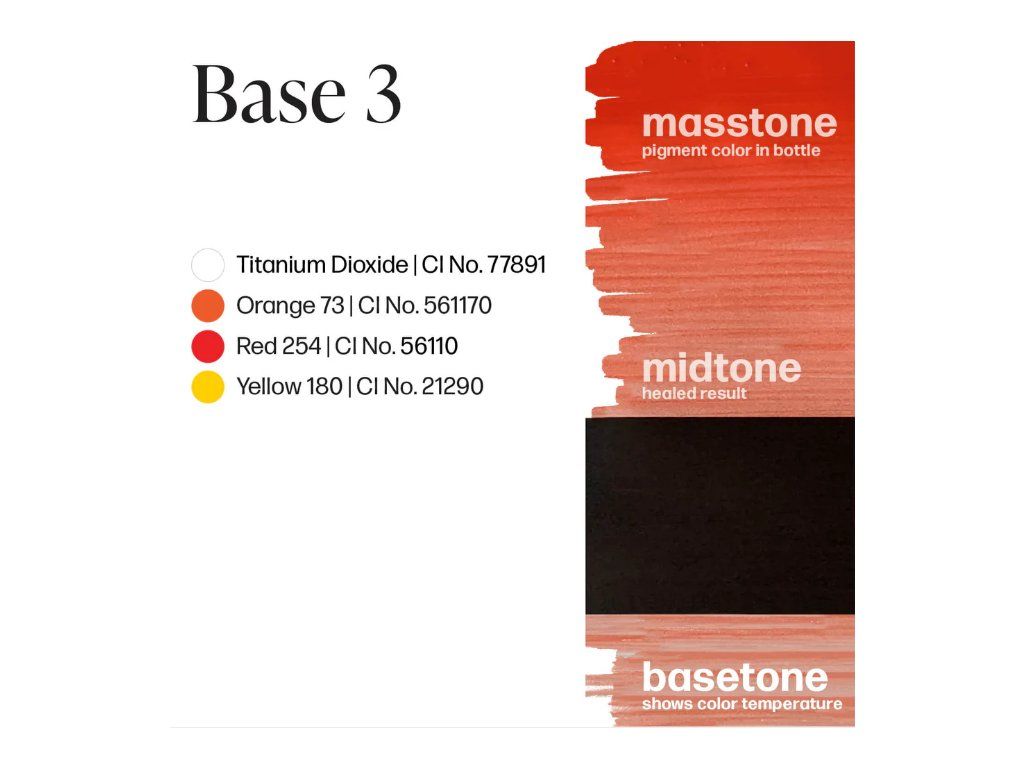 Base 3 is een rood-oranje pigment, dat titaandioxide bevat voor maximale dekking en de nodige correctie. Deze formulering is bedoeld om te verdunnen en moet worden gecombineerd met Embody Set Mods 1-3 of een schaduwoplossing.