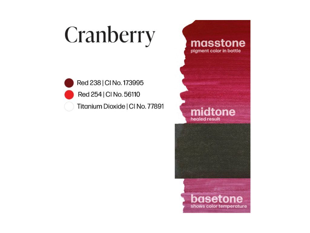 Pigment voor donkere cranberry lippen met een roodroze ondertoon, lage dekking en koele basis.