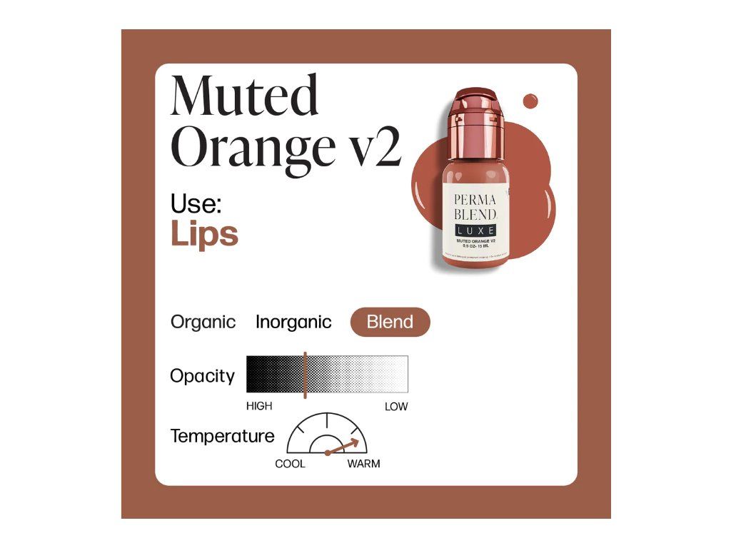 Een gedempte sinaasappelkleur die alleen kan worden gebruikt op lichte of medium lichte natuurlijke lippen of als neutralisator. Gemiddelde tot hoge dekking en een warme basis.