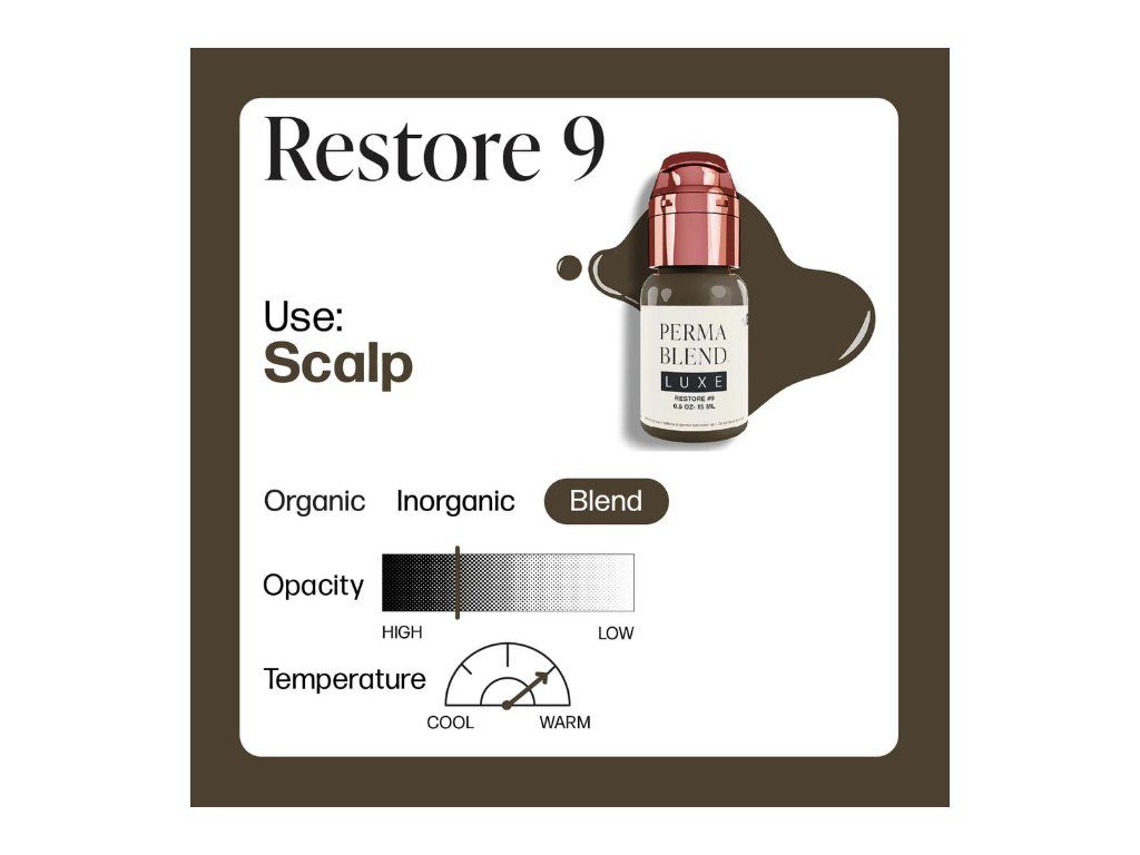 Restore 9 is een licht warme klassieke, grijsbruine kleur die haarfollikels nabootst. *Het wordt het best gebruikt als aanvulling op de Restore Set.