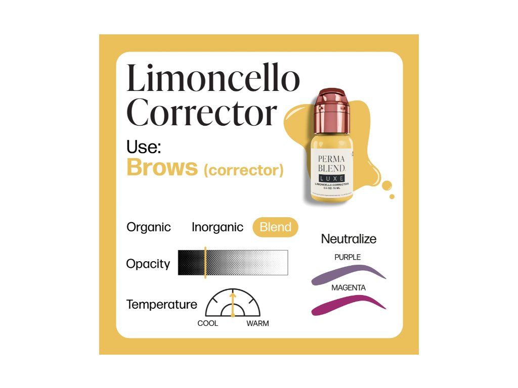Limoncello verbeteraar uit de Perma Blend Luxe Rescue Mini Set is een heldere en frisse wenkbrauwcorrector die vervaging van wenkbrauwen in blauw- en paars-tinten corrigeert.