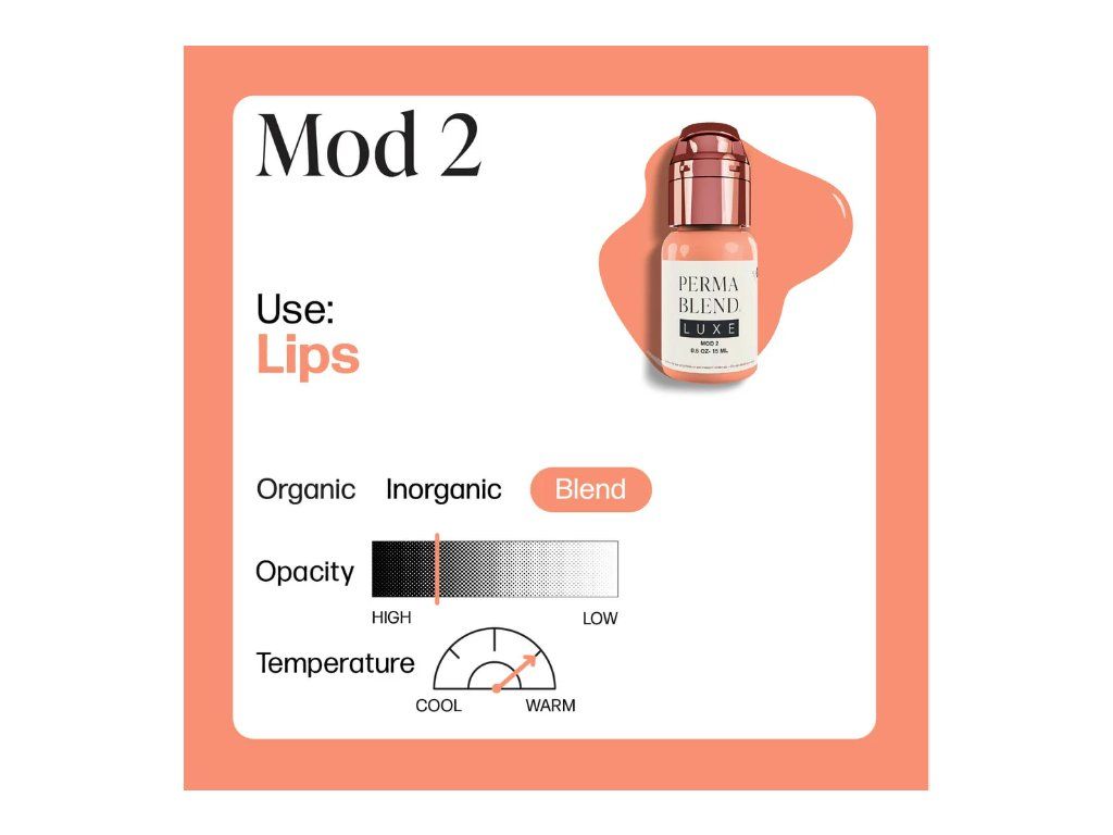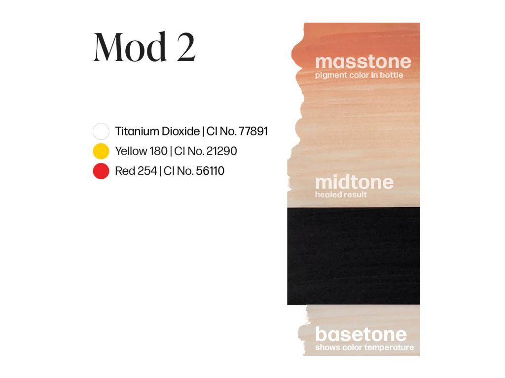 Mod 2 is een bruiningsmodifier voor op het strand die de waarde van geneutraliseerde lippen verandert zonder de gewenste basistint drastisch te veranderen. Het moet worden toegevoegd aan de aanpassing van BASE-pigmenten 1-4 uit de Embody Set. Mod verhoogt de waarde of verheldert elk pigment in de set en creëert verschillende tinten.