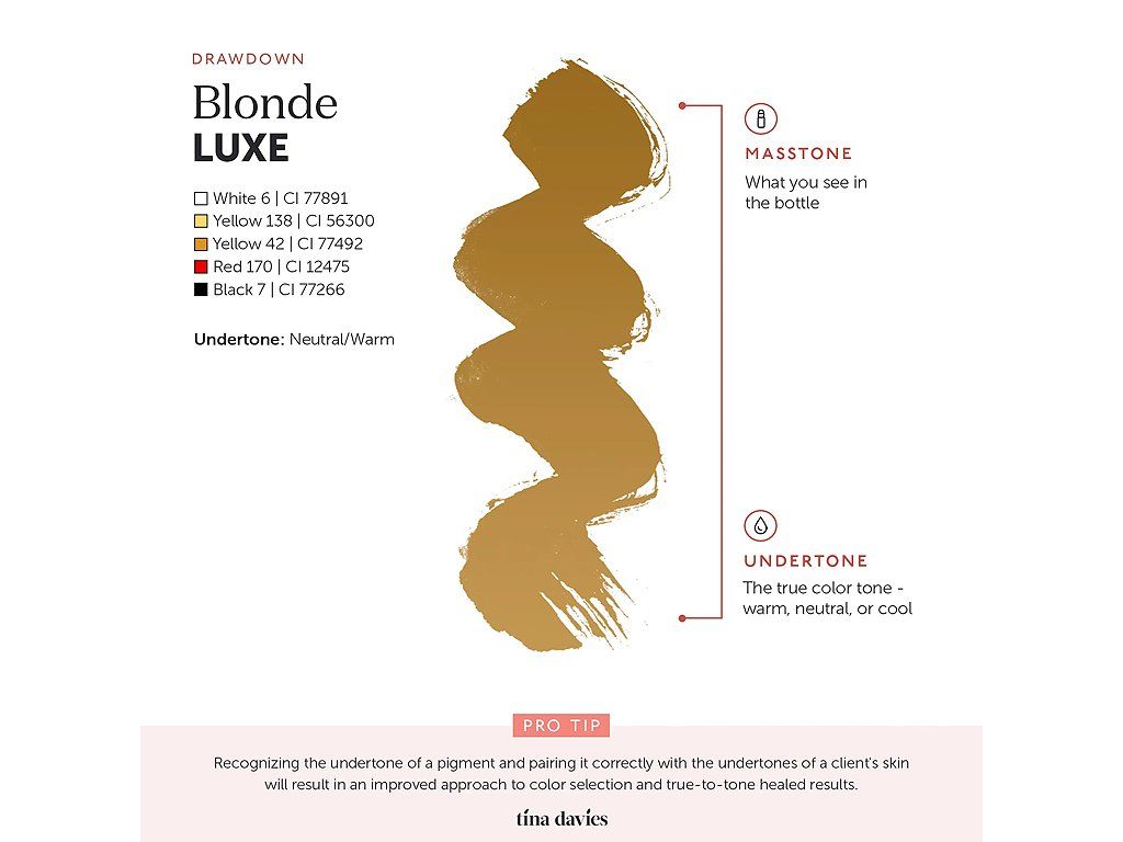 Blonde Luxe uit de Perma Blend Luxe I Love Ink Eyebrow Collection van Tiny Davies is een licht taupe-tint met een gele ondertoon. Blonde kan worden gebruikt voor klanten met een lichte of roze huid om een zeer natuurlijke look te creëren. Het kan worden gebruikt om oranje, rode, groene en paarse kleuren te corrigeren.