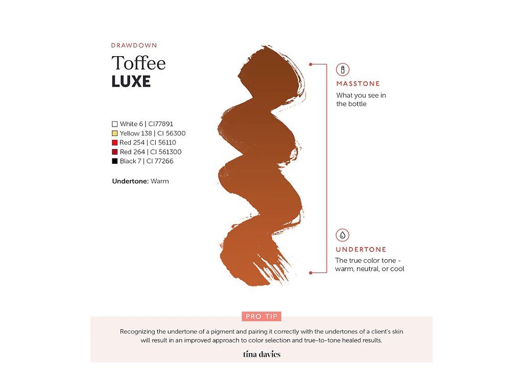 PERMA BLEND LUXE - TINA DAVIES TOFFEE - Perfectie in een karameltint. Dit warme roodbruine pigment is ideaal voor klanten met rood haar. Gebruik het op zichzelf of als warme modifier voor elke kleur. Dit is een hybride product, voornamelijk samengesteld uit organische ingrediënten.
