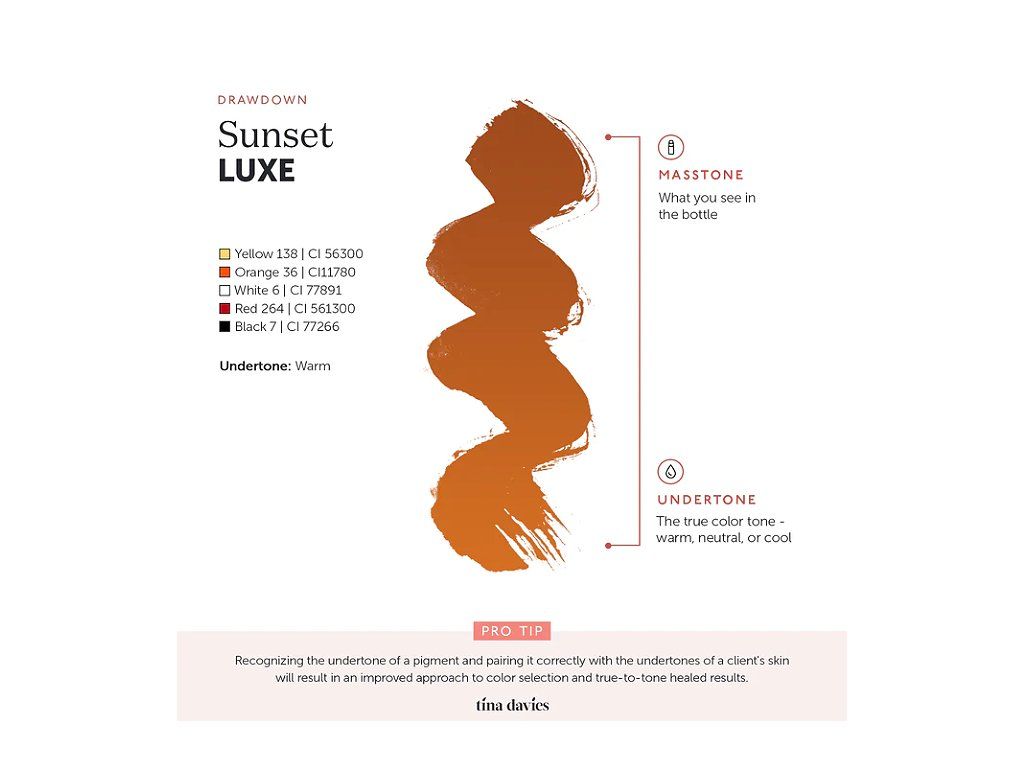 PERMA BLEND LUXE - TINA DAVIES - SUNSET - stralend en goudkleurig. Dit lichte pigment kan op zichzelf worden gebruikt om een prachtige aardbeiblonde tint te creëren, of als een warme modifier voor extra warmte. Dit is een hybride product, voornamelijk samengesteld uit organische ingrediënten.