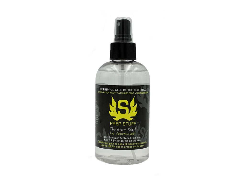 Prep Stuff is een professionele oplossing die wordt gebruikt om de afdruk snel van de huid te verwijderen. Als u de sjabloon verkeerd afdrukt, kunt u deze eenvoudig wissen met Prep Stuff. Prep Stuff is ook een desinfectiemiddel dat altijd moet worden gebruikt voordat u het ontwerp op de huid afdrukt. Het verwijdert veilig 99,9% van de virussen en bacteriën van de huid, maar laat belangrijke huidoliën achter. Het is ook bewezen dat met de Prep Stuff-oplossing de afdruk langer op de huid blijft zitten.