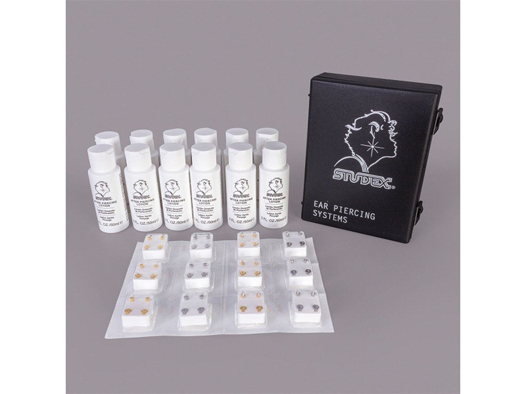 Het Studex Plus startpakket maakt gebruik van Studex oor piercing studs, die vooraf gesteriliseerd en hypoallergeen zijn. De studs worden rechtstreeks uit de gesteriliseerde verpakking in het oor-piercinginstrument geplaatst. De oorlel wordt in 1/10 seconde doorboord, wat het ongemak minimaliseert en een goede genezing bevordert. Het Studex Plus starterspakket wordt geleverd met twaalf flesjes After Piercing Solution en twaalf paar oorstekers.