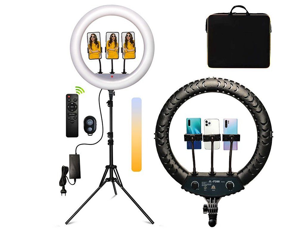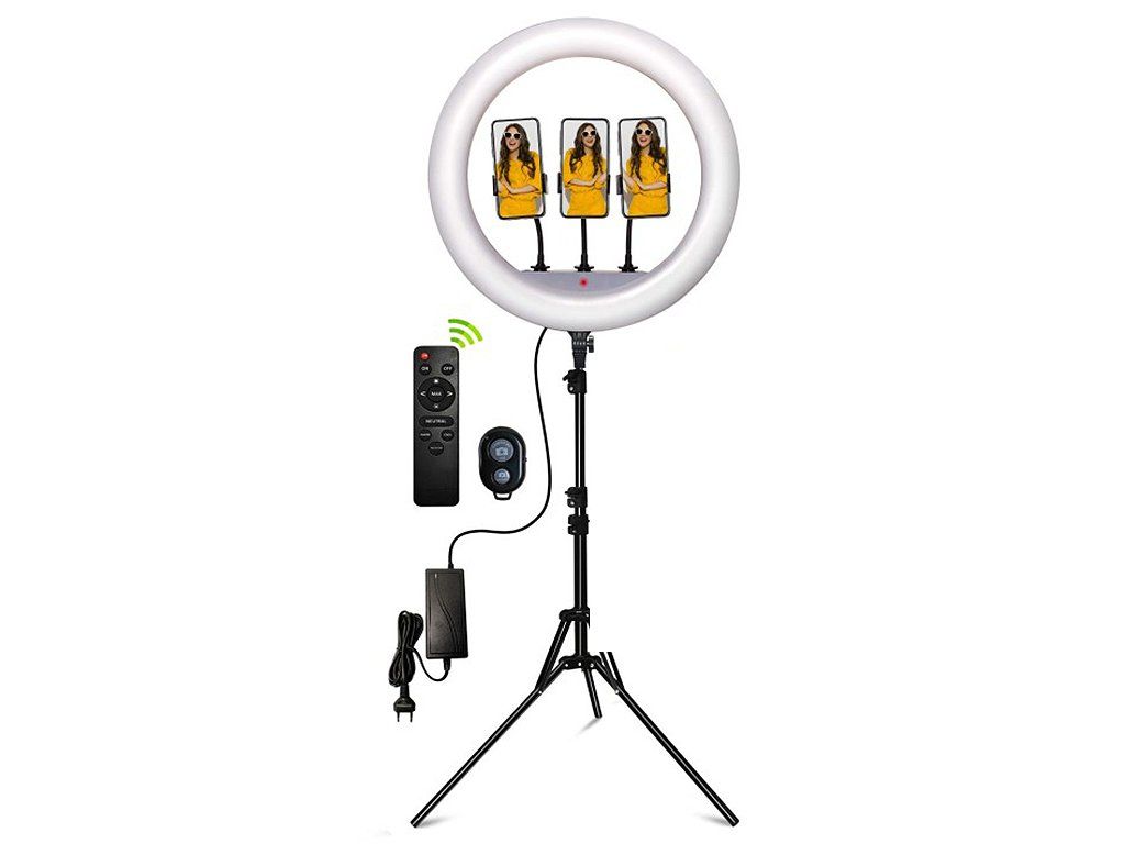 TILT HOEK TOT 45° EN ACCESSOIRES VOOR SOCIALE MEDIA - De SwavGo LED ringlamp heeft een kantelhoek tot 45°. De fotografieset bevat ook drie smartphonehouders, een afstandsbediening voor het instellen van het licht en een Bluetooth-afstandsbediening die koppelt met uw smartphone om op afstand foto's te maken. Ideaal voor het creëren van content op social media platforms zoals Instagram, TikTok, etc.