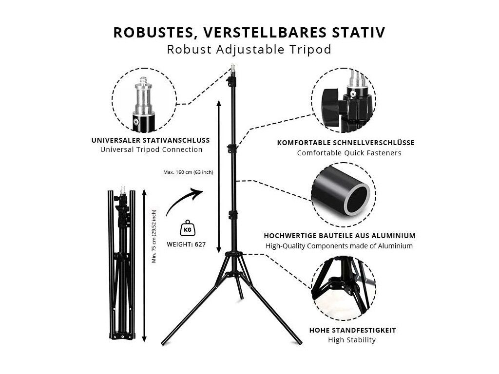 - Verstelbare statiefhoogte: 75 cm (29,52 inch) tot max. 160 cm (63 inch)