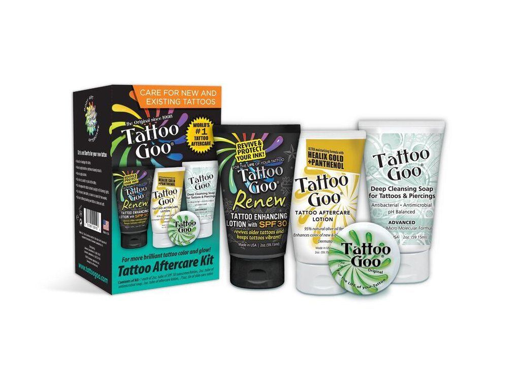 De ideale set voor de verzorging van nieuwe tatoeages. Bevat: Tattoo Goo zeep 60ml voor het reinigen van nieuwe tatoeages Tattoo Goo After Tattoo crème 21g voor de verzorging van nieuwe tatoeages Tattoo Goo Lotion 60ml voor de verzorging van genezen tatoeages Tattoo Goo Renew voor bescherming tegen de zon en het opfrissen van kleuren van oudere tatoeages