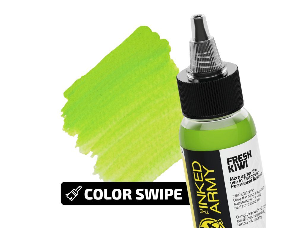 THE INKED ARMY Fresh Kiwi is een heldere groentint, geïnspireerd door de kleur van verse kiwi. Het biedt een pure, energieke toon die zowel in volle vullingen als in gedetailleerde kleurelementen opvalt.