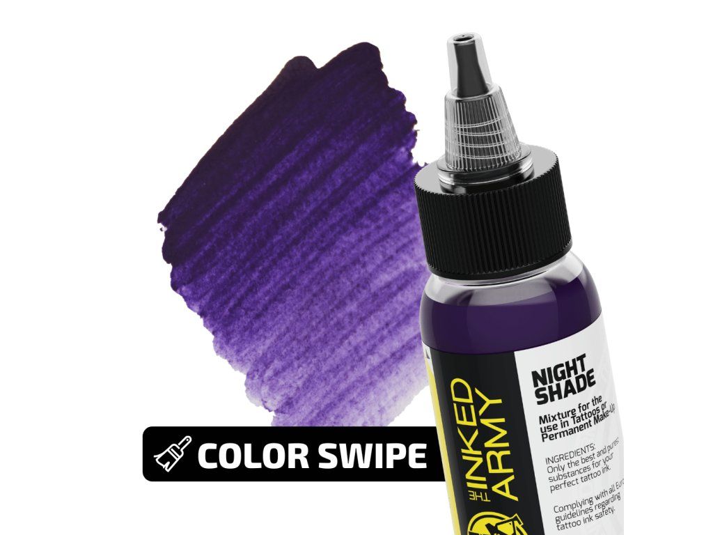 THE INKED ARMY Night Shade is een intense dieppaarse kleur uit de serie professionele tatoeagekleuren geproduceerd in Duitsland. Deze tint biedt een intense diepte en verzadiging, waardoor donkere, dramatische delen en vloeiende overgangen naar lichtere tinten mogelijk zijn.
