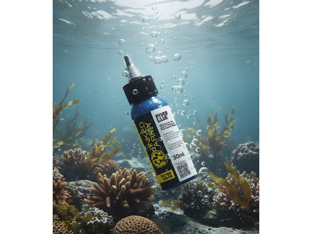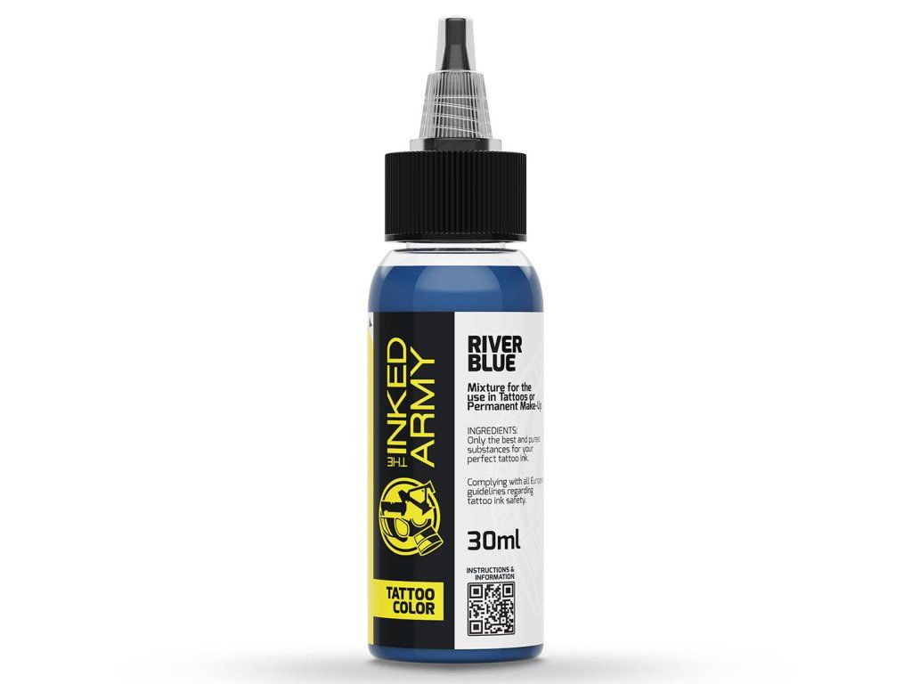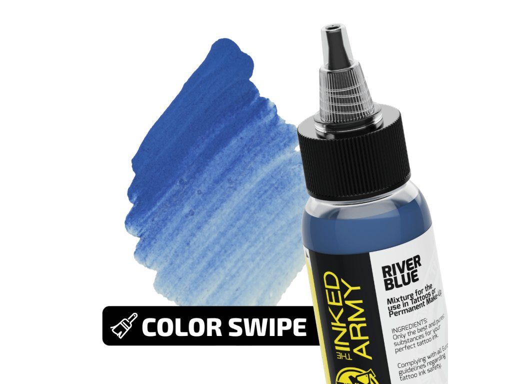 THE INKED ARMY River Blue is een stabiele blauwe tint geïnspireerd op de kleur van een rivieroppervlak. Het biedt een pure tint en een gelijkmatige dekking, waardoor nauwkeurig werk mogelijk is bij gedetailleerde motieven en grotere kleurvlakken.